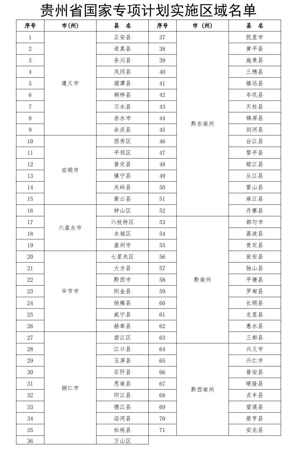 中央部门所属高校、各省(市、区)所属重点高校及我省贵州大学、贵州师范大学、贵州财经大学、贵州民族大学、贵州医科大学、遵义医科大学、贵州中医药大学、贵州师范学院和贵州理工学院将面向全省71个县(市、区)实施国家专项计划(贵州省国家专项计划实施区域名单见下表)。招生计划由教育部统一下达,并在《贵州省2025年普通高校招生专业目录》上公布。