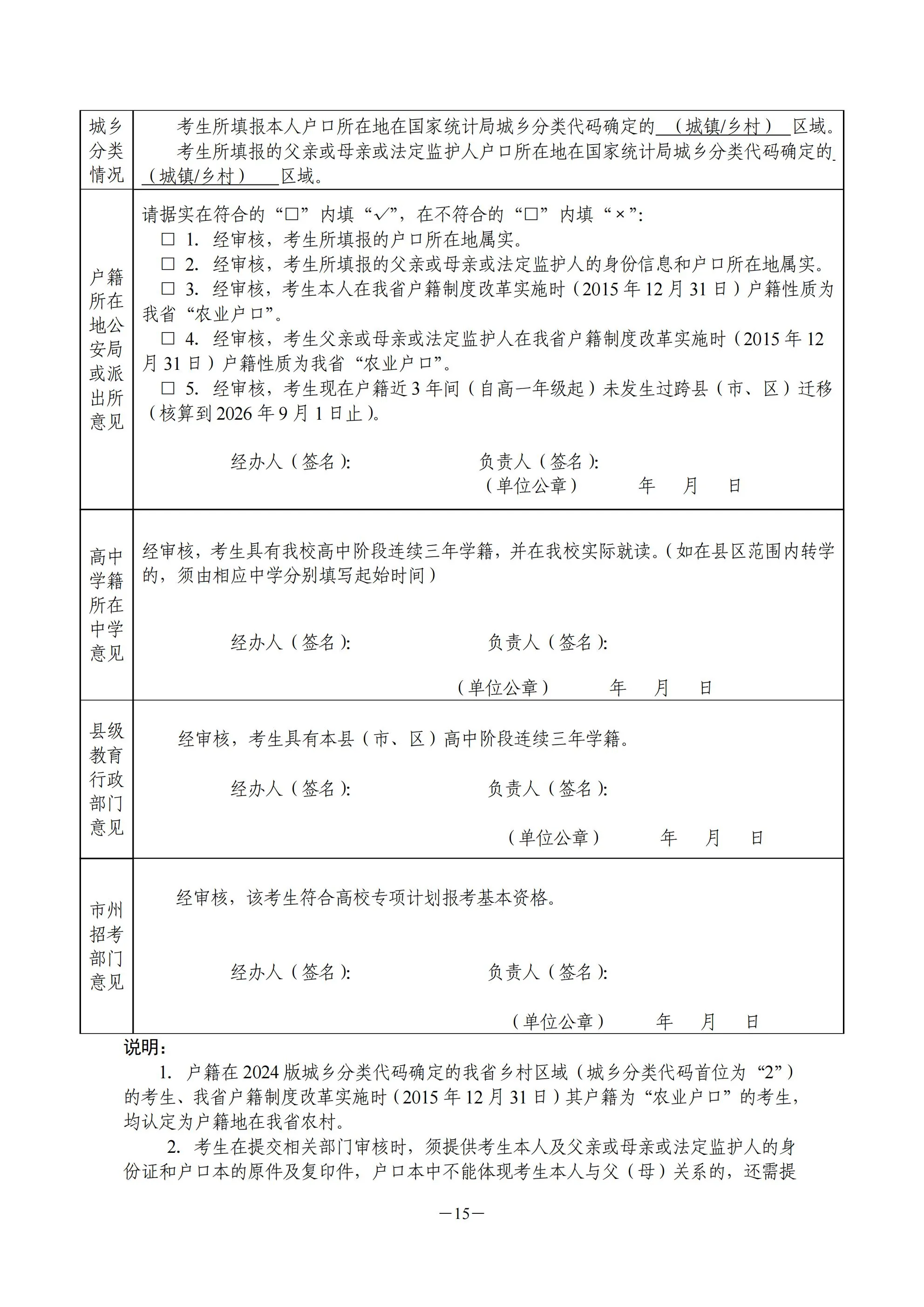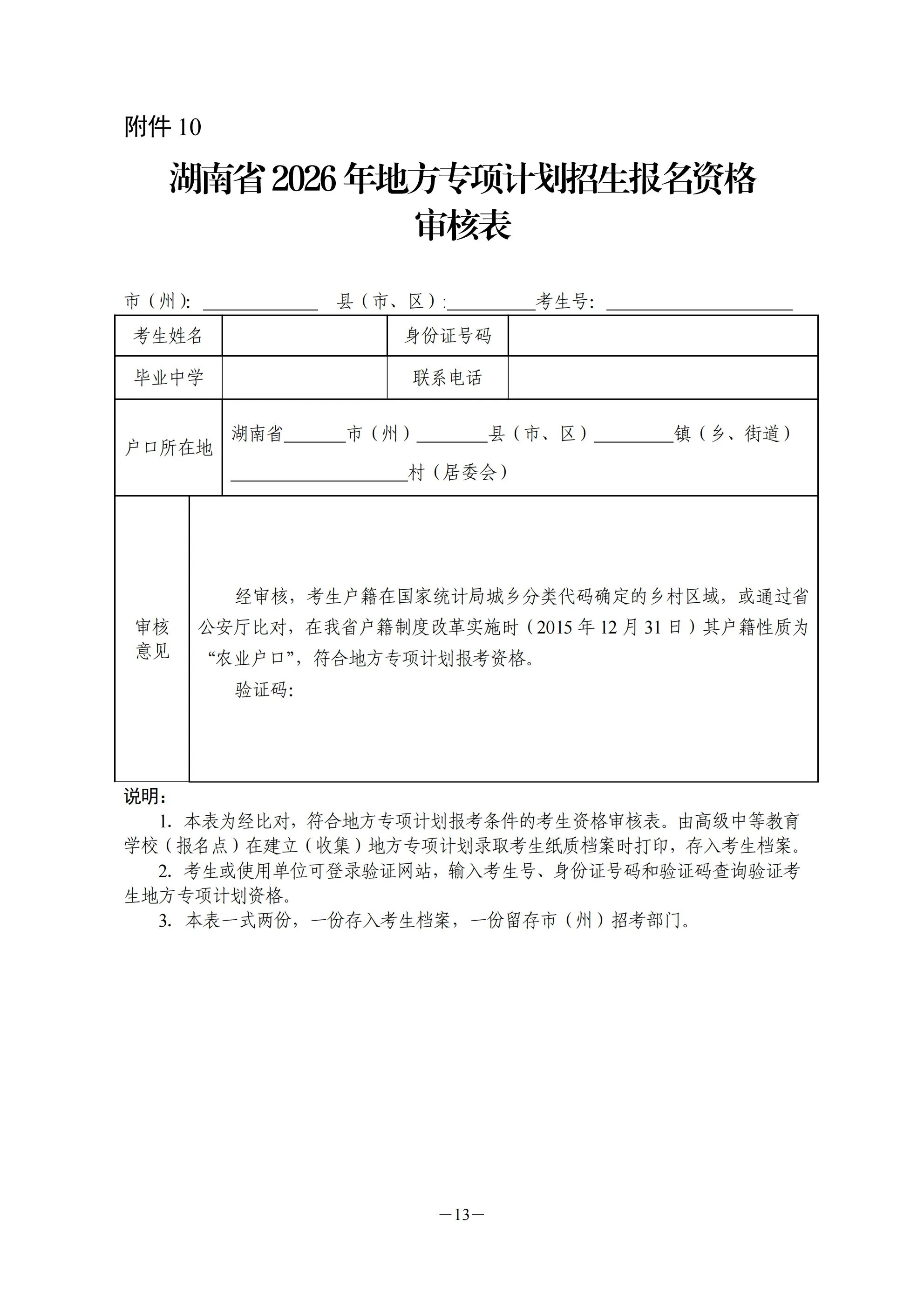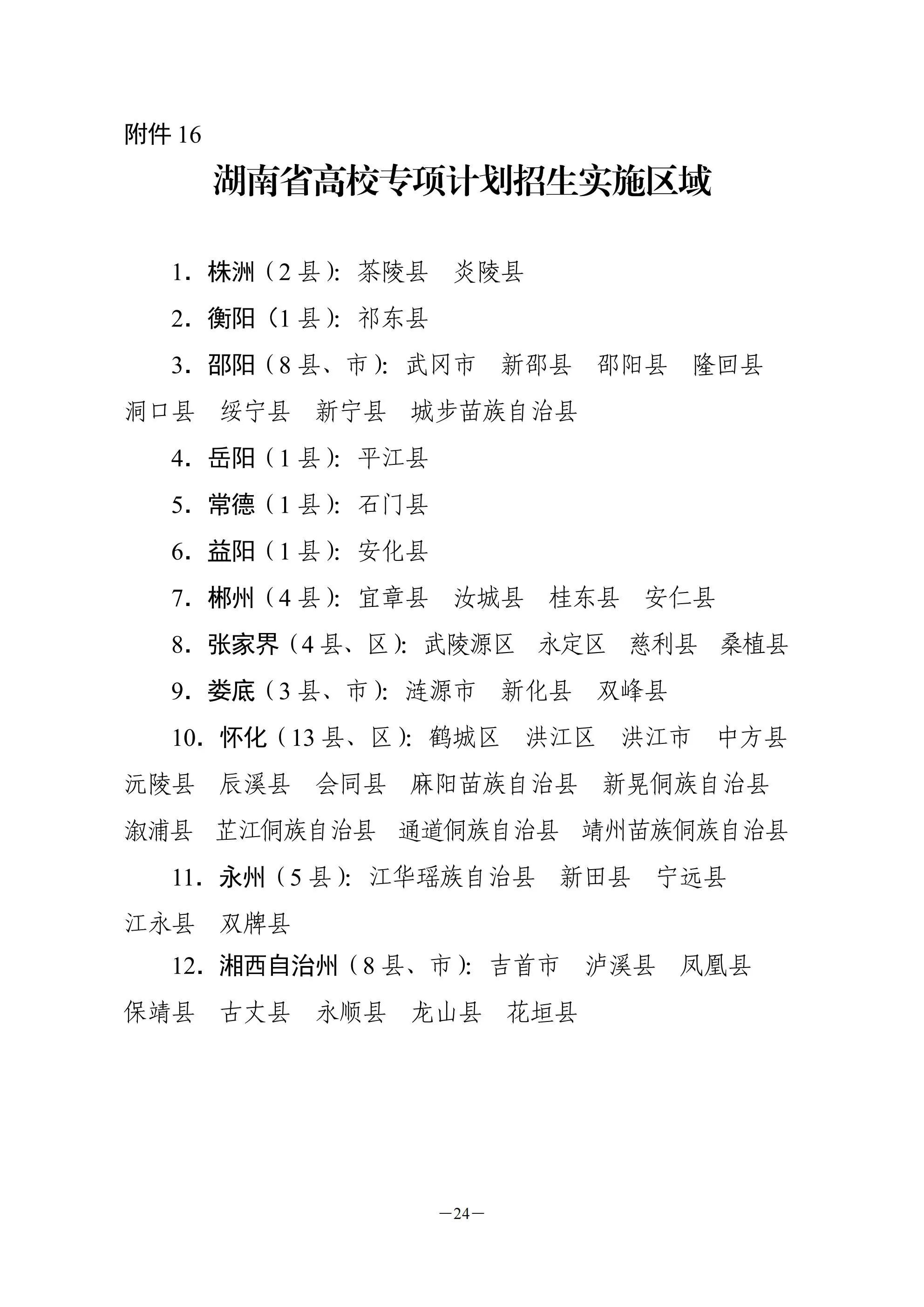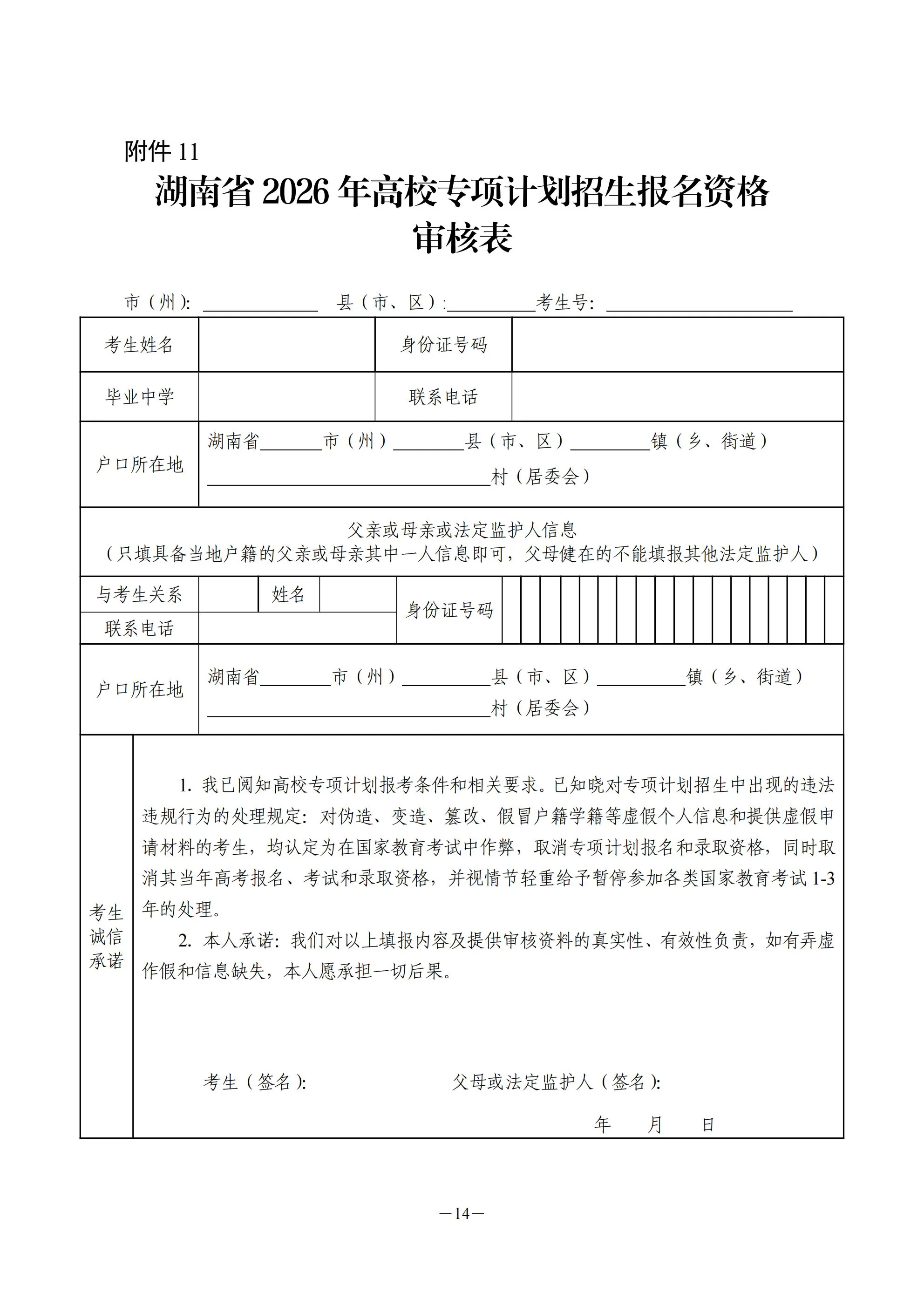 (三)高校专项计划。按照相关规定,我省实施高校专项计划的区域为茶陵县等51 个县(市、区)(见附件16)。报考学生须同时具备以下基本条件:(1)符合我省2026年统一高考报名条件并已参加当年高考报名;(2)考生本人及其父亲或母亲或法定监护人户籍在我省实施区域且城乡分类代码确定为乡村区域(2024版统计用区划代码和城乡划分代码中城乡分类代码首位为“2”),或在我省户籍制度改革实施时(2015年12月31日)户籍为我省实施区域的农业户口,其中考生本人须具有当地连续3年以上户籍;(3)考生本人具有户籍所在县(市、区)高中连续3年学籍并实际就读。在此基础上,有关高校可提出其他报考要求并在招生简章中明确。