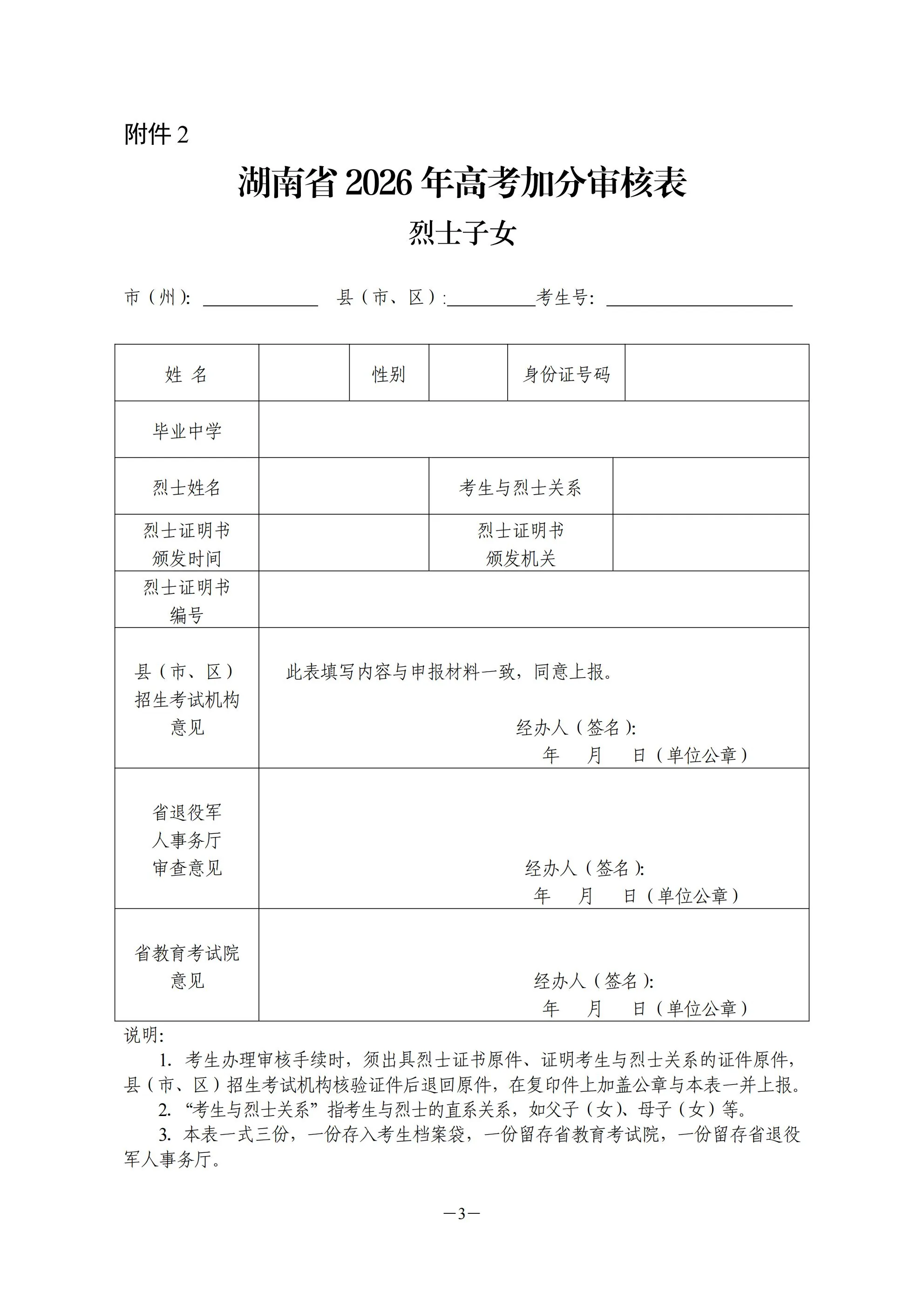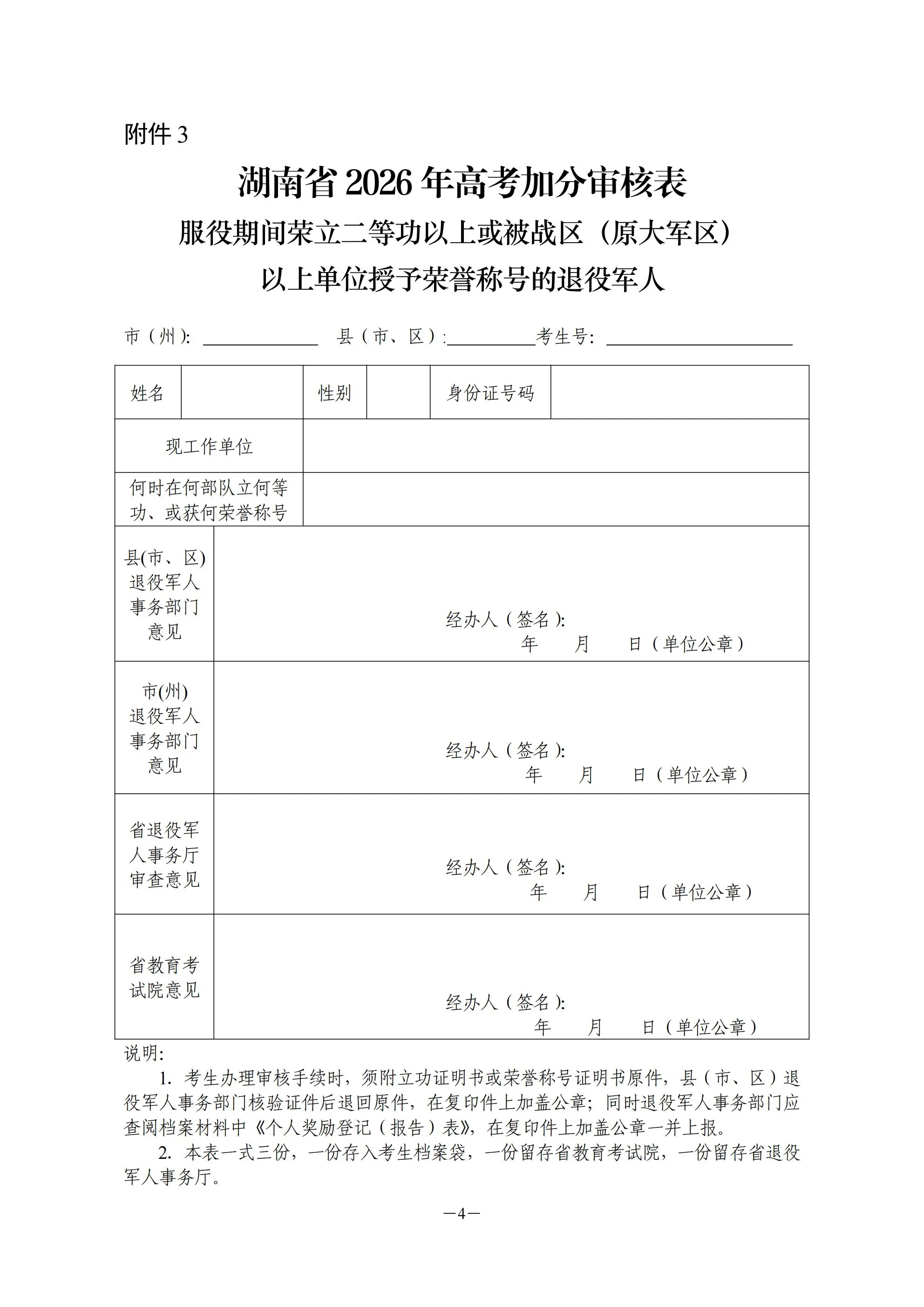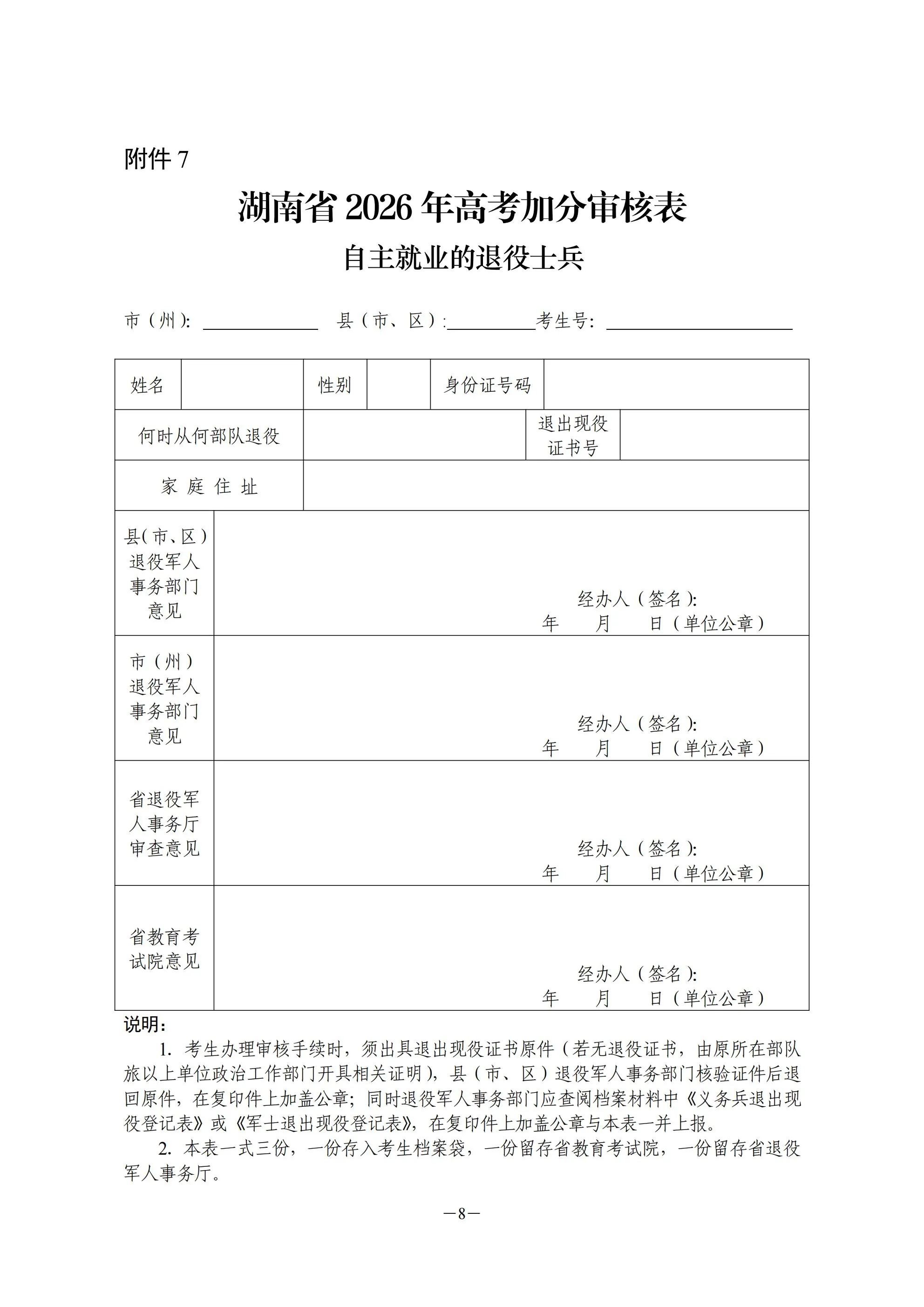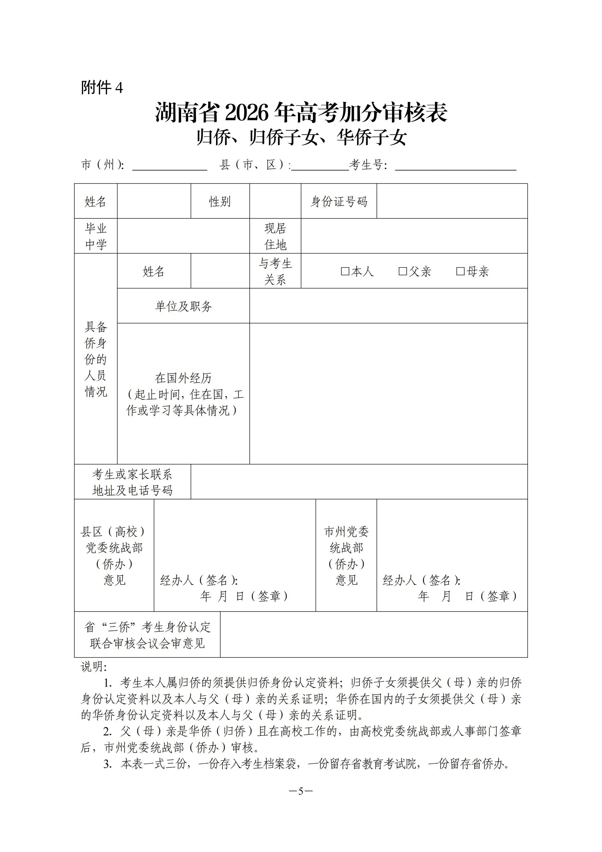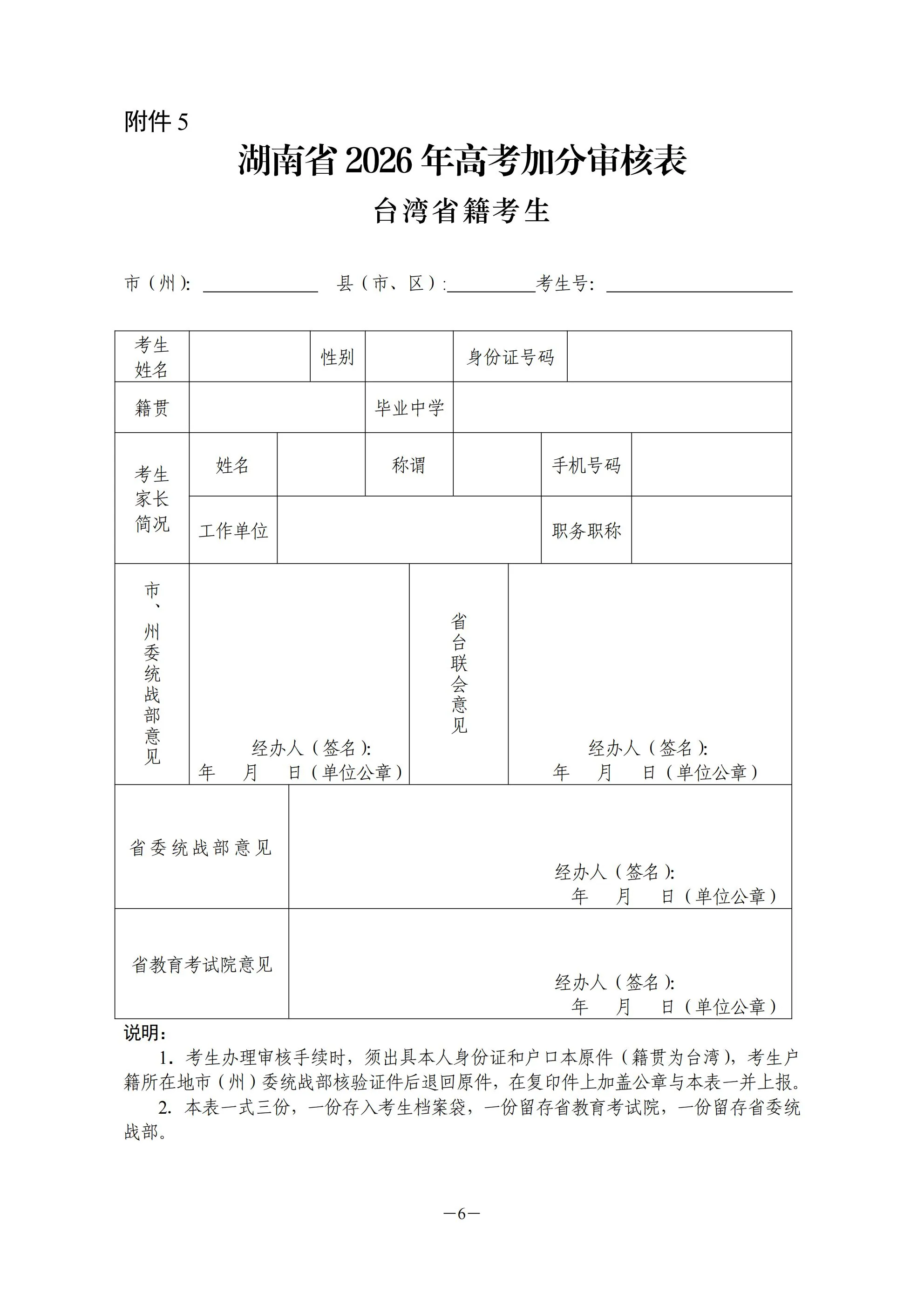 (1)2026年2月7日起(2月27日后申报的,3月7日起),高级中等教育学校(报名点)可打印下列表格:烈士子女高考加分审核表;服役期间荣立二等功以上或被战区(原大军区)以上单位授予荣誉称号的退役军人高考加分审核表;归侨、归侨子女、华侨子女高考加分审核表;台湾省籍考生高考加分审核表;台湾户籍考生高考加分审核表;自主就业的退役士兵高考加分审核表;国家专项计划招生报名资格审核表;高校专项计划招生报名资格审核表。