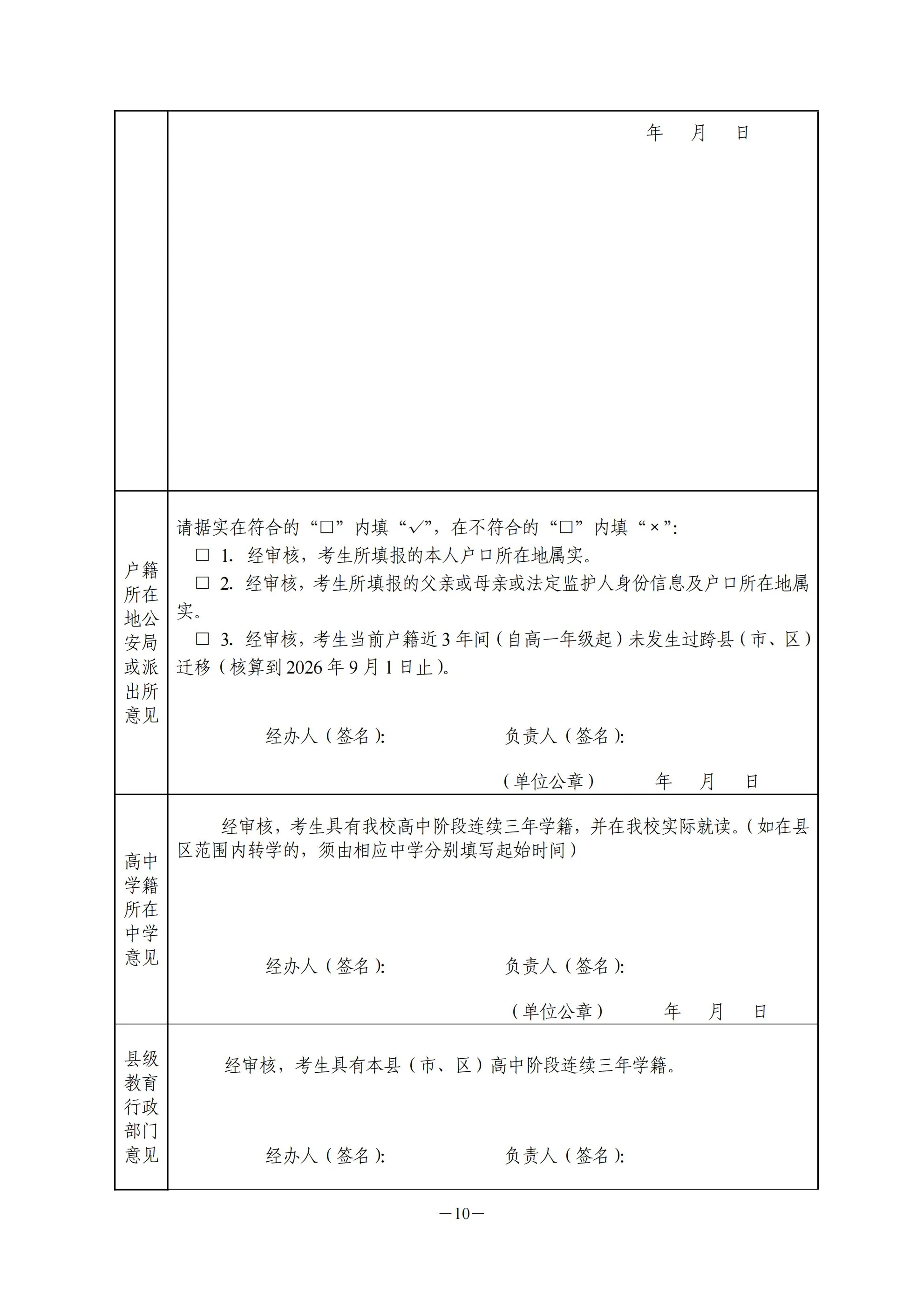4.上交资格审核表。2026年3月26日前,考生将县(市、区)、市(州)相关部门审核完成的各类审核表交至高级中等教育学校(报名点),由高级中等教育学校(报名点)逐级上报至省教育考试院。