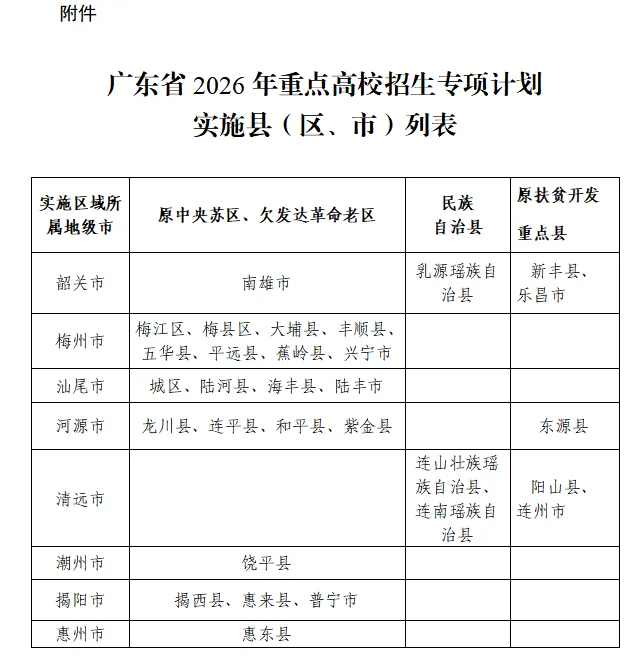 附件:广东省2026年重点高校招生专项计划实施县(区、市)列表