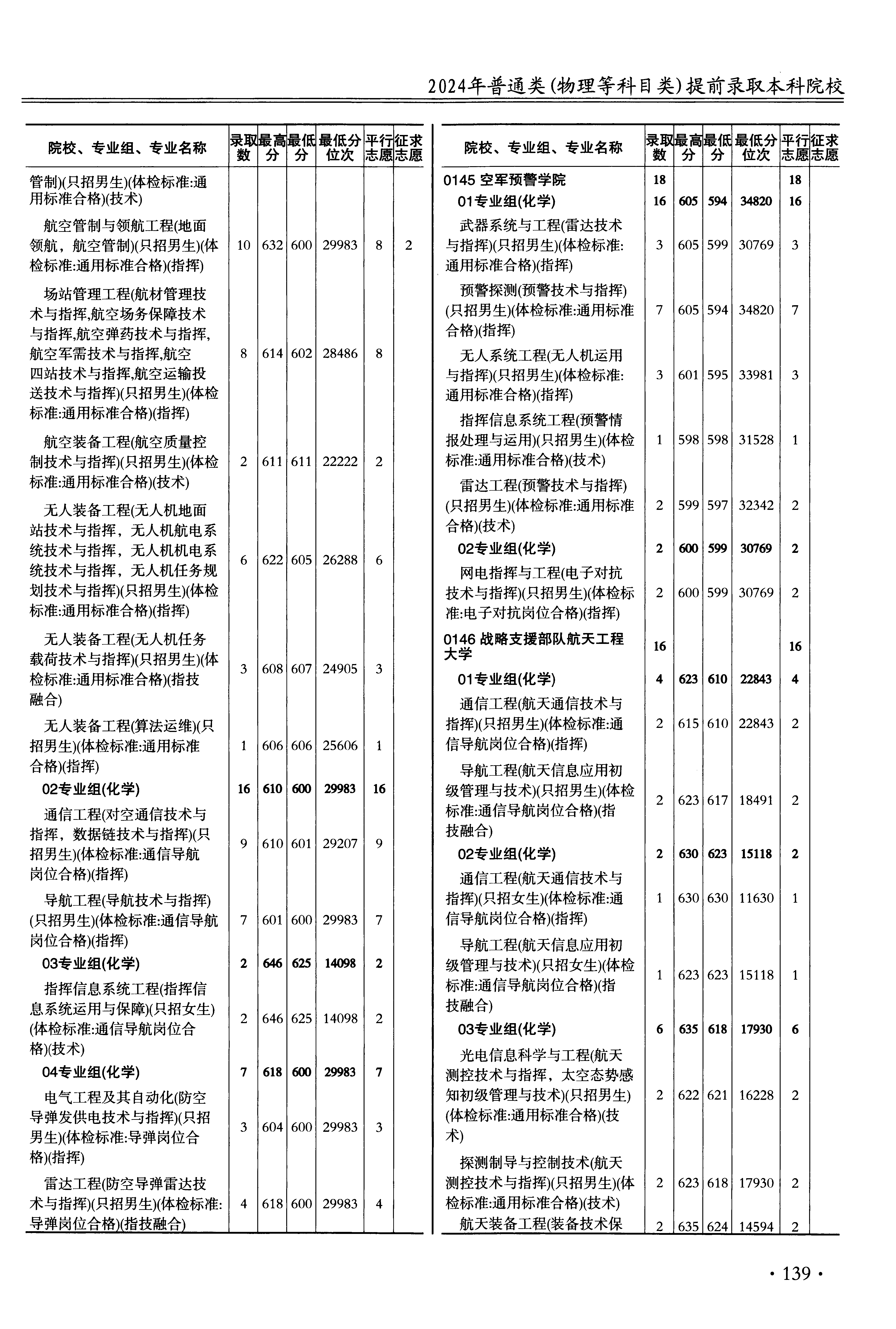 | 0144 | 空军工程大学 | 15 | 指挥信息系统工程(指挥信息系统运用与保障)(只招女生)(体检标准:通信导航岗位合格)(技术) | 625 | 14098 | 本科 | 物理 ,再选: 化学 | 1 |