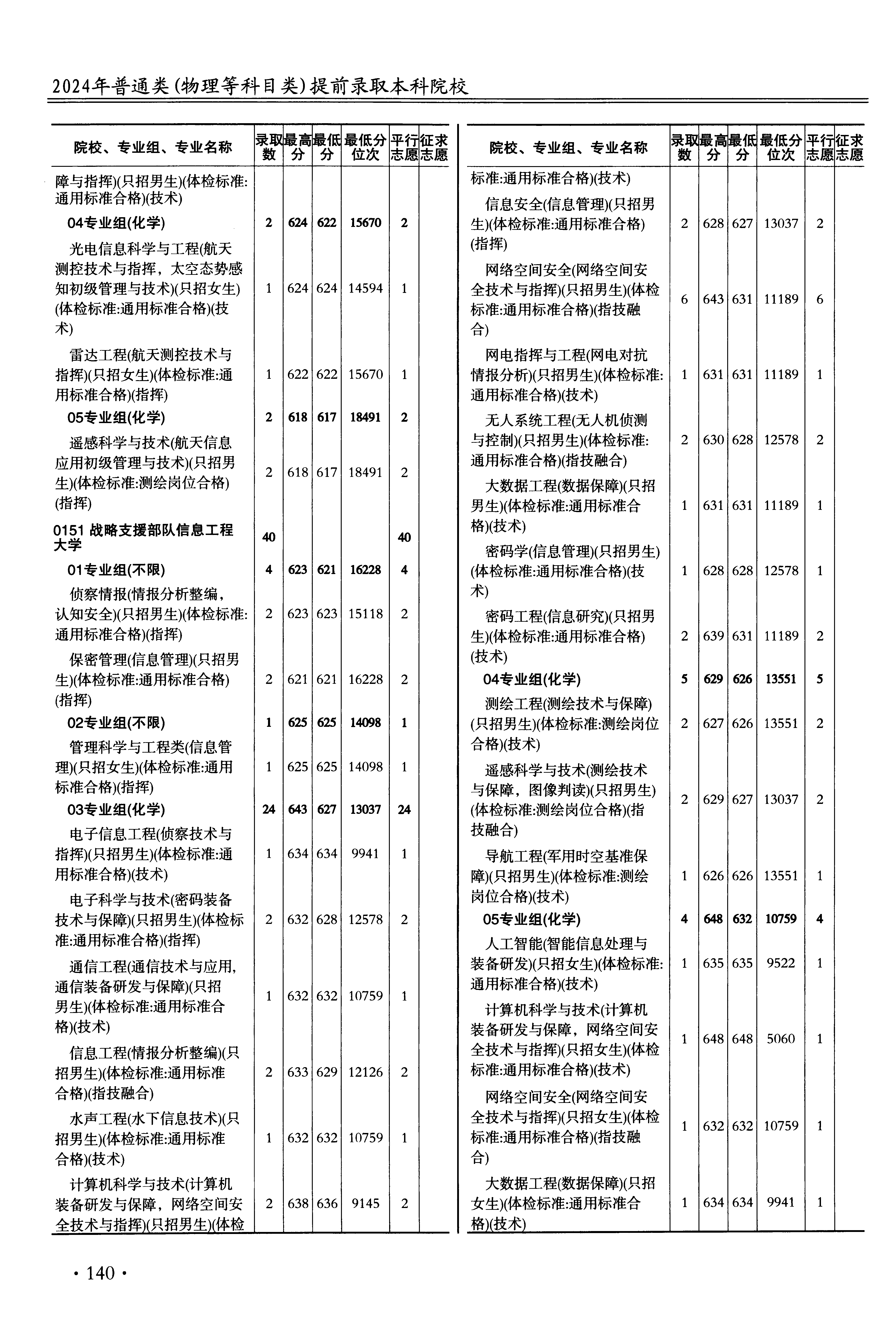 | 0151 | 战略支援部队信息工程大学 | 21 | 计算机科学与技术(计算机装备研发与保障。网络空间安全技术与指挥)(只招女生)(体检标准:通用标准合格)(技术) | 648 | 5060 | 本科 | 物理 ,再选: 化学 | 1 |