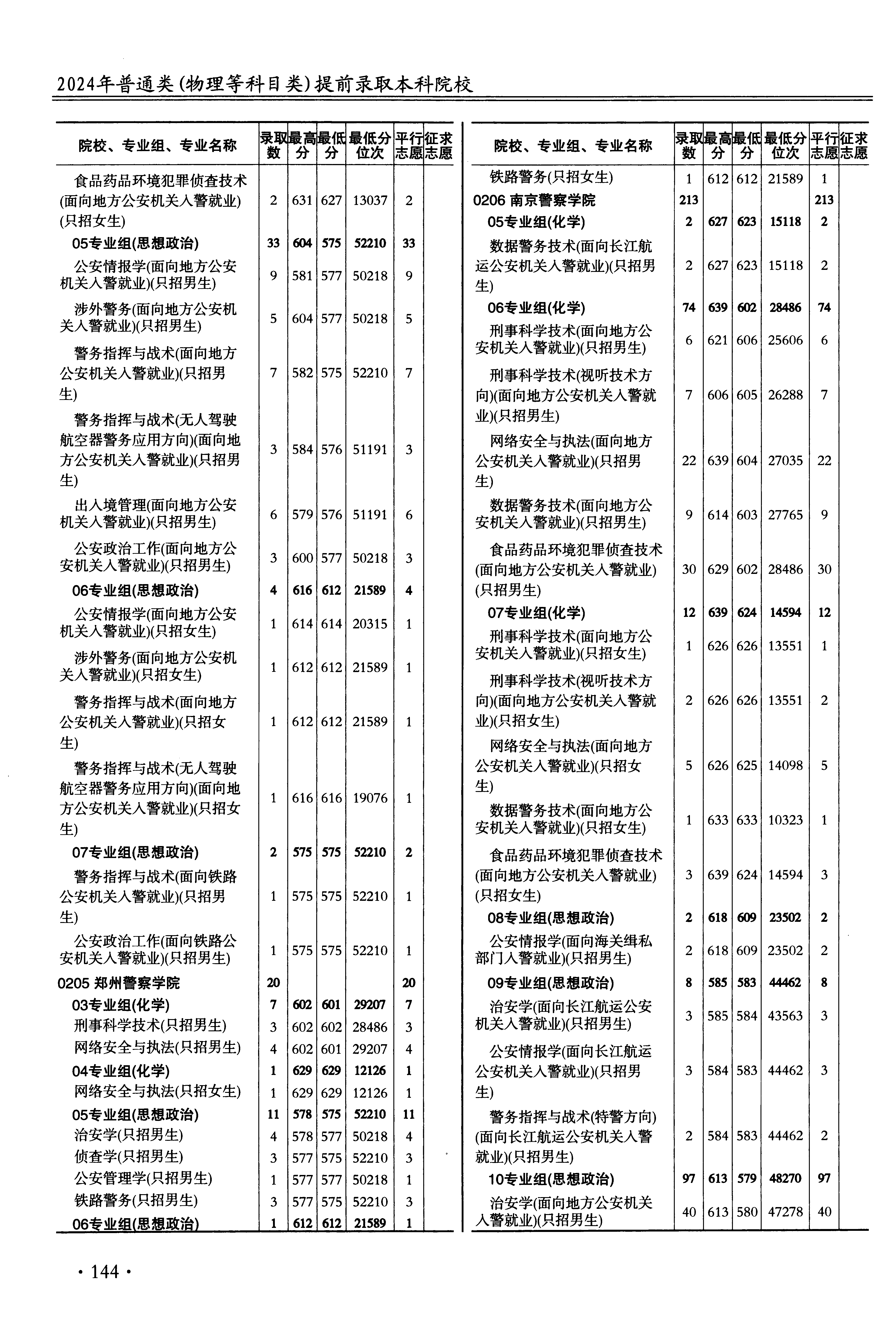 | 0206 | 南京警察学院 | 35 | 公安管理学(面向地方公安机关入警就业)(只招男生) | 579 | 48270 | 本科 | 物理 ,再选: 思想政治 | 1 |