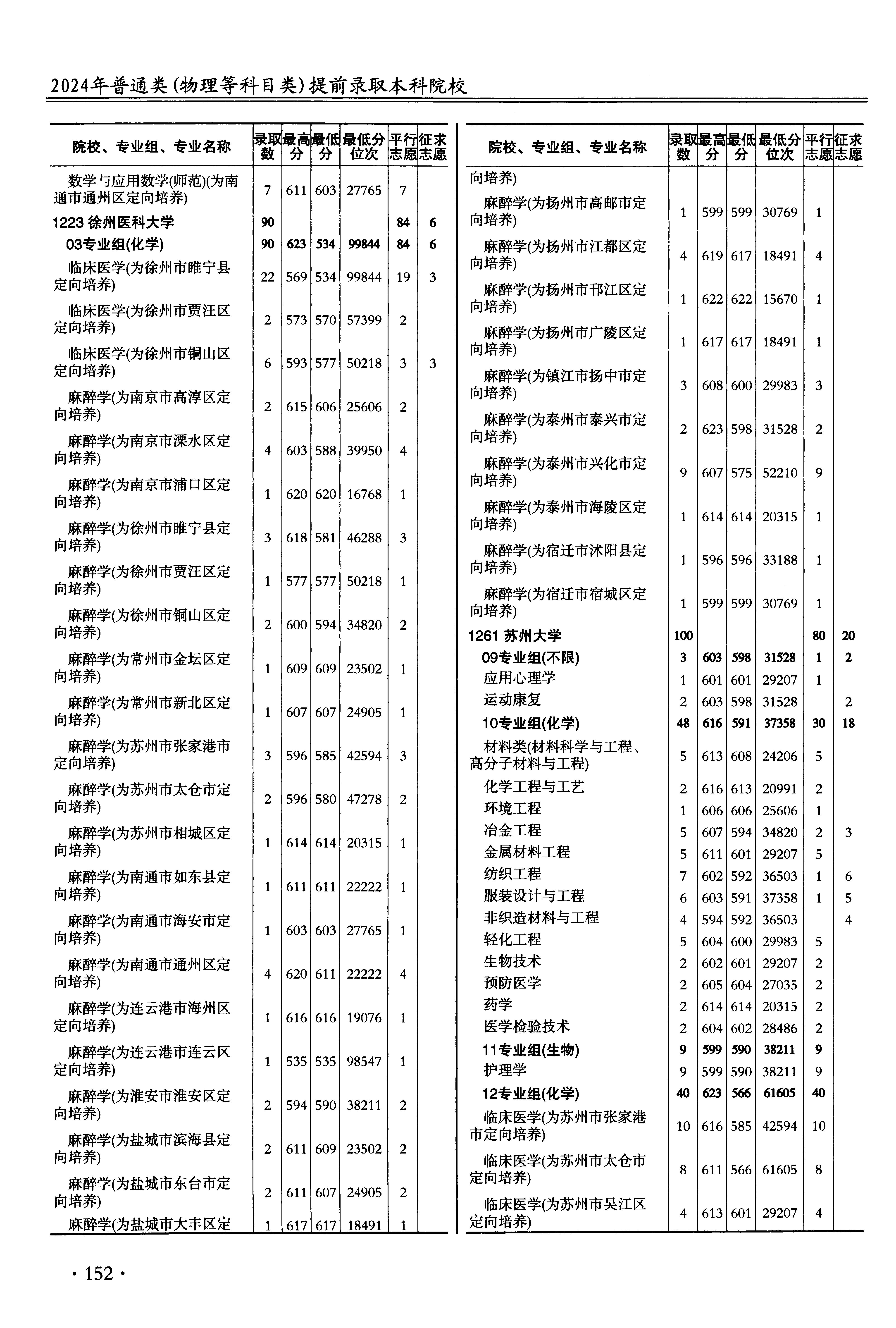 2024年江苏高考普通类本科提前批医学定向 徐州医科大学 的 麻醉学 专业录取分数溯源信息