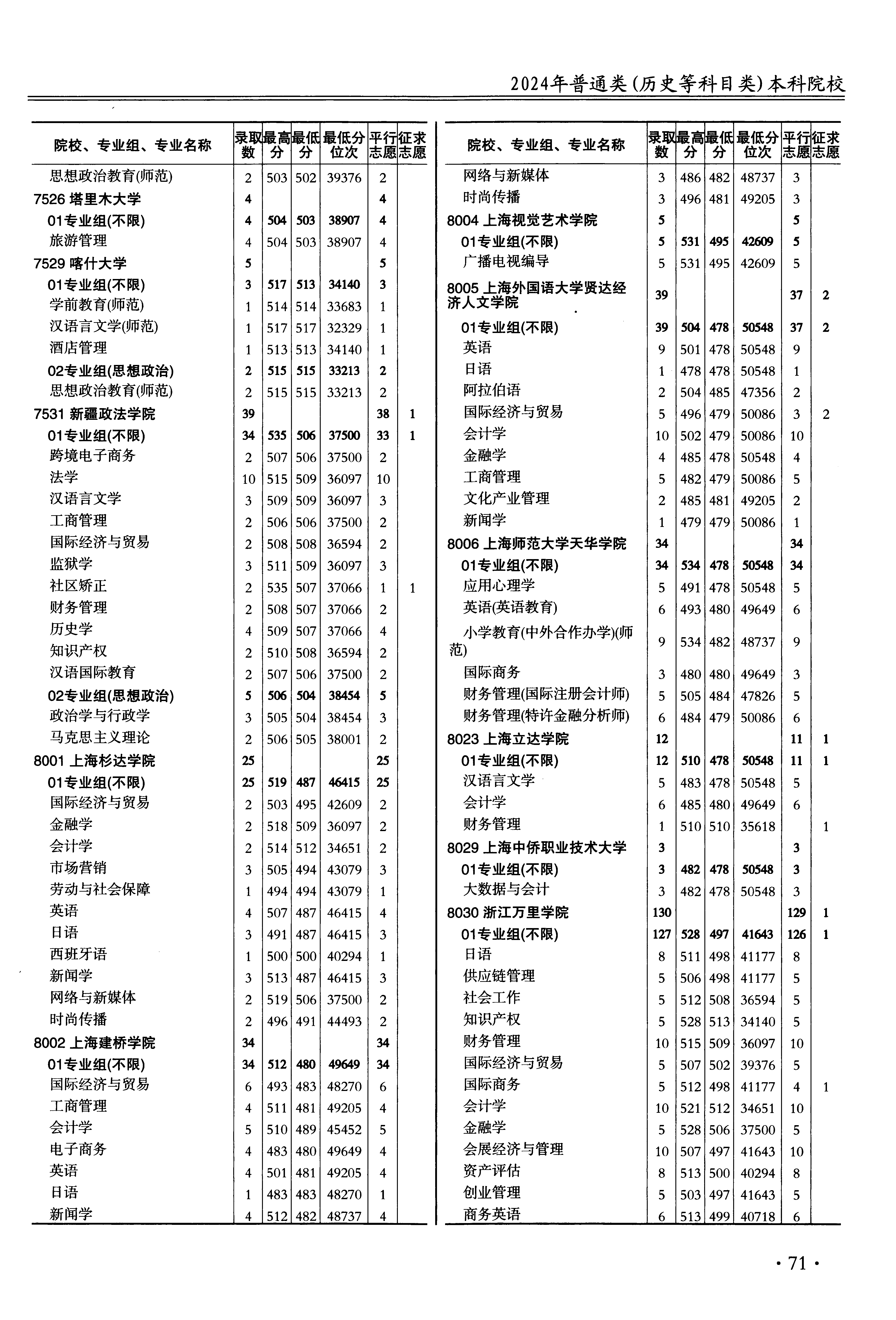 | 院校代码 | 院校名称 | 专业代码 | 专业名称 | 最低分数 | 最低位次 | 专业层次 | 限考科目 | 投档 |