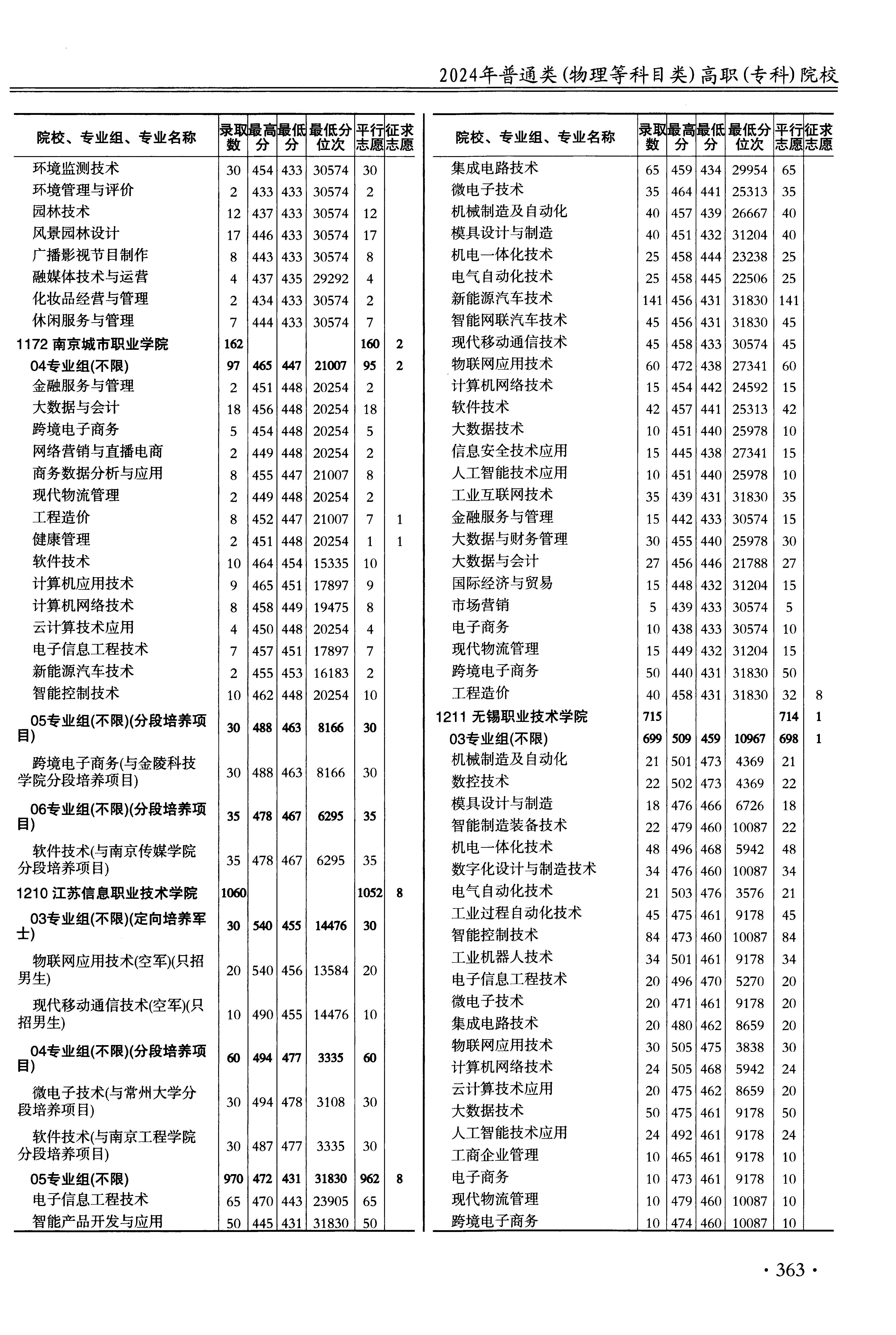 2024年江苏高考普通类高职(专科)批 无锡职业技术学院 的 大数据技术 专业录取分数溯源信息