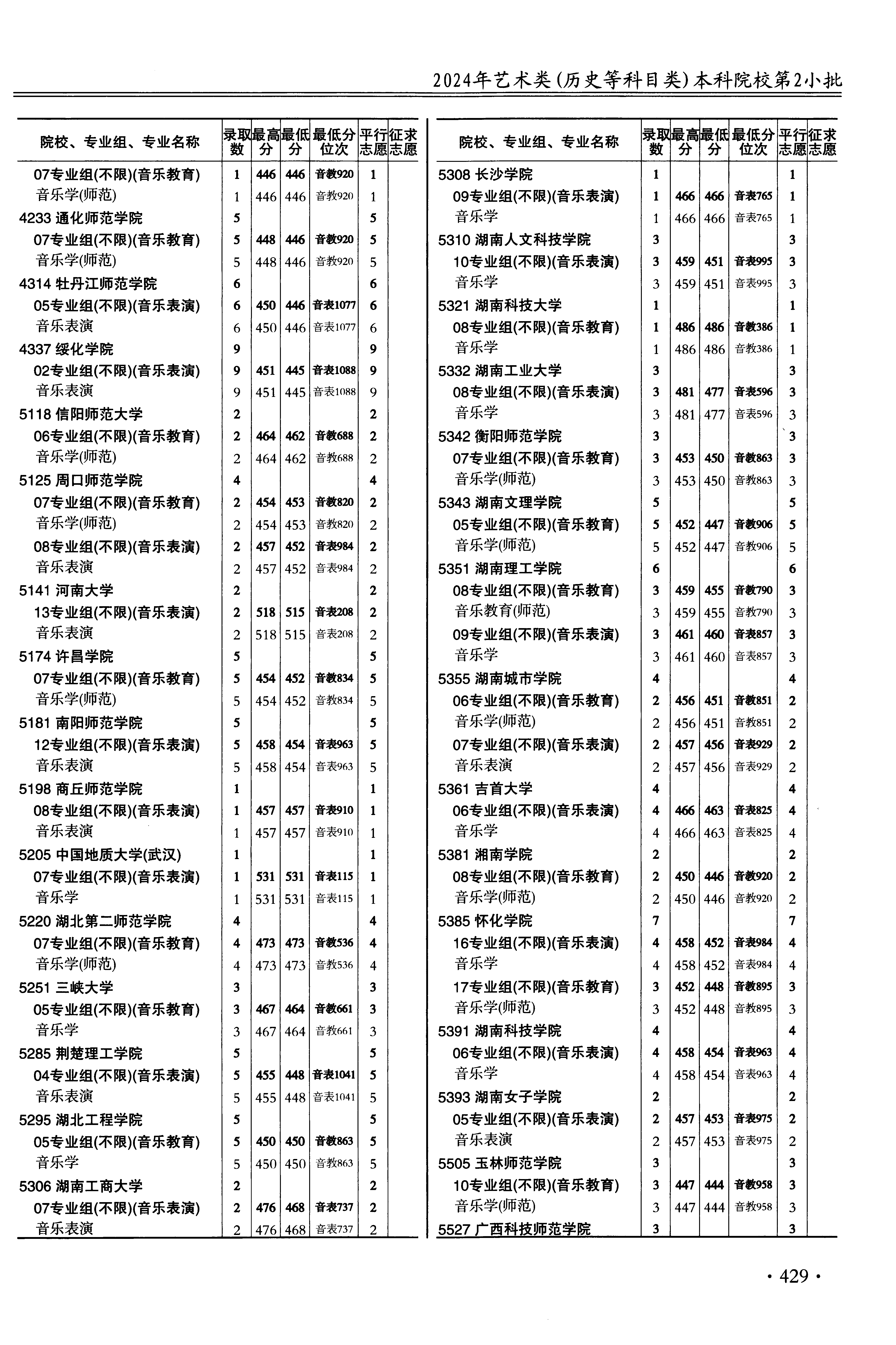 2024年江苏高考艺术类本科提前批第2小批音乐类教育类器乐主项 湖南科技大学 的 音乐学 专业录取分数溯源信息