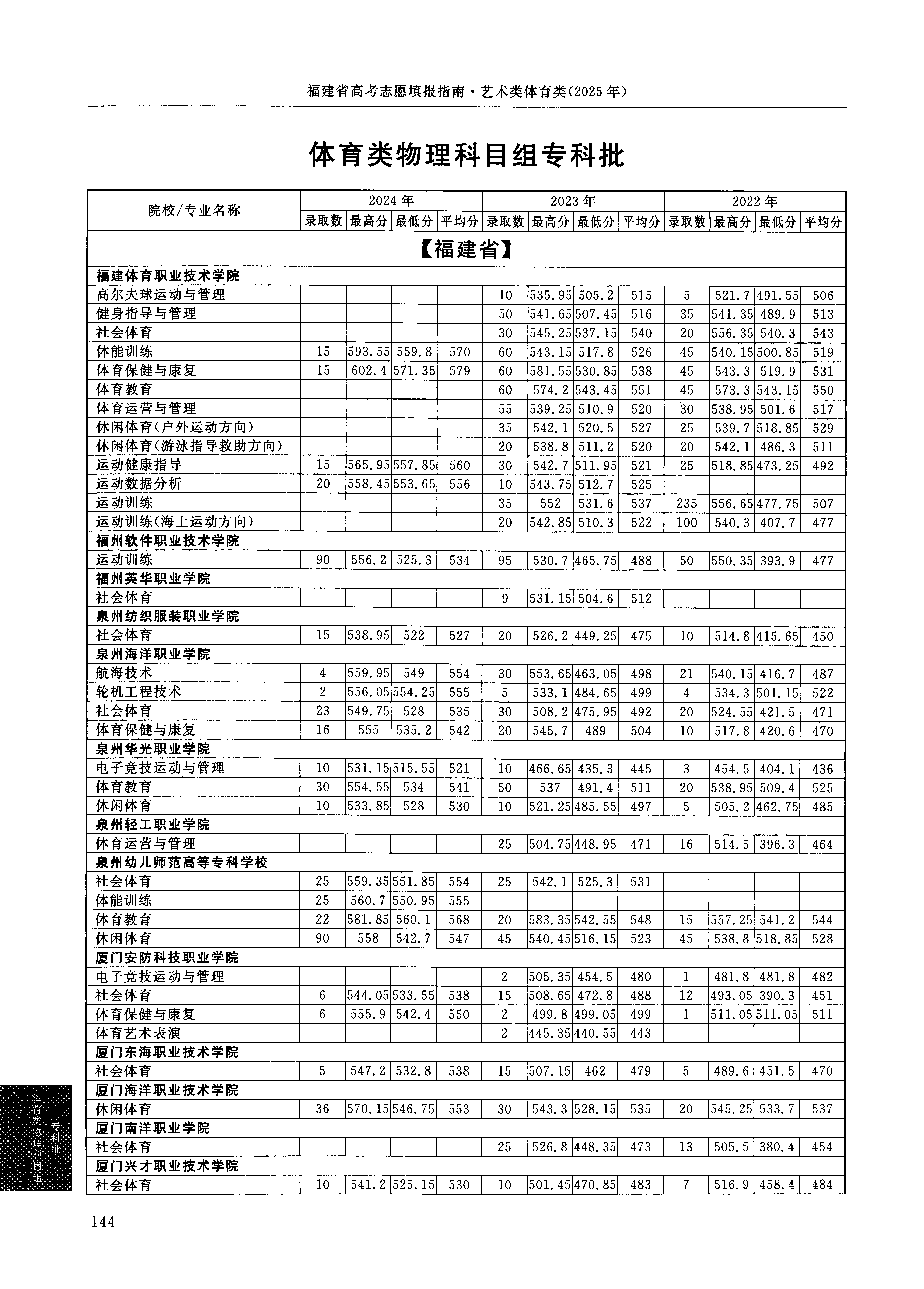| 7052 | 泉州纺织服装职业学院 | 046 | 社会体育 | 522.00 | 专科 | 物理 ,再选: 不限 | 1 | |