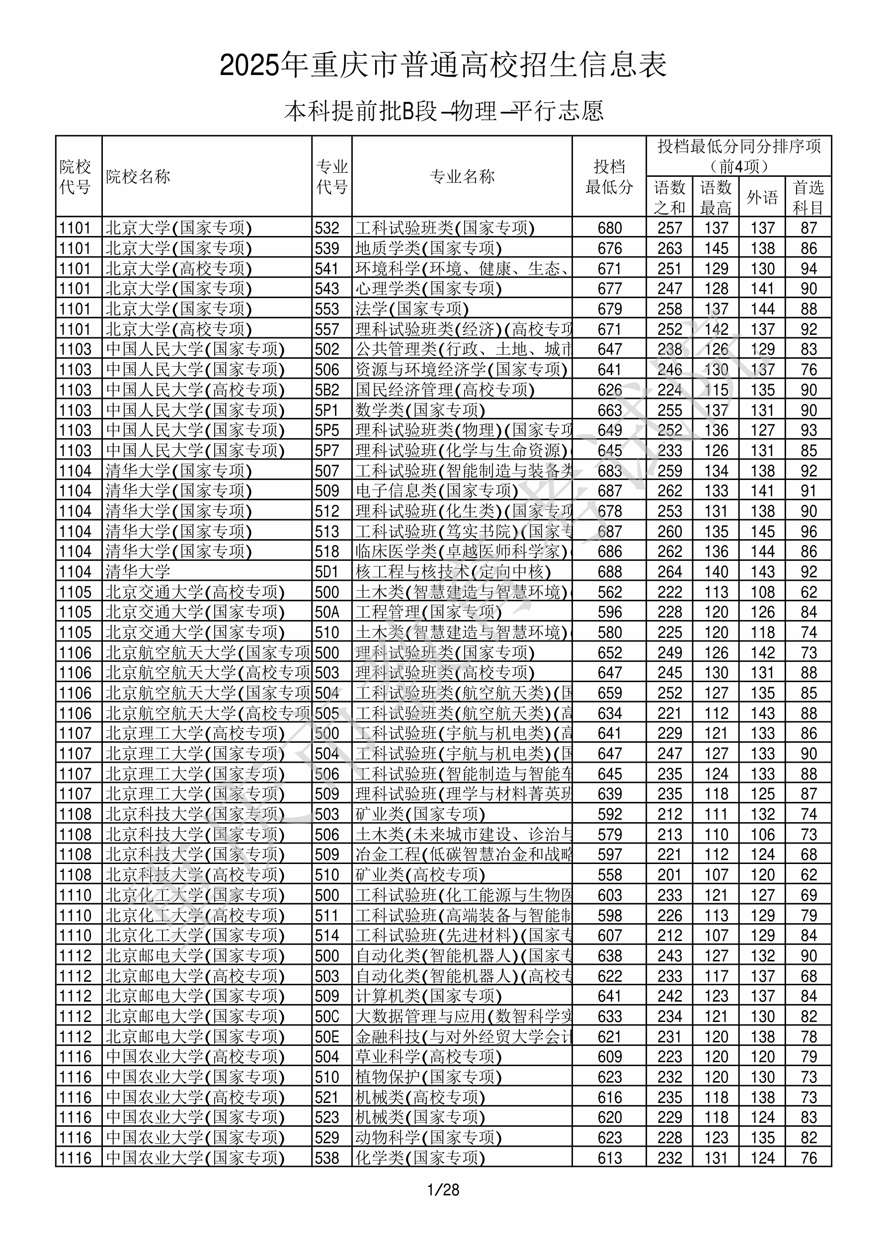 2025年重庆高考普通类本科提前批B段 北京化工大学 的 工科试验班 专业录取分数溯源信息