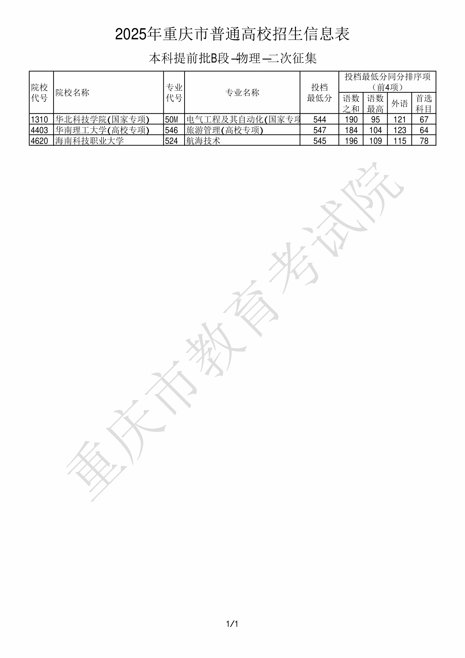 2025年重庆高考普通类本科提前批B段 华南理工大学 的 旅游管理 专业录取分数溯源信息