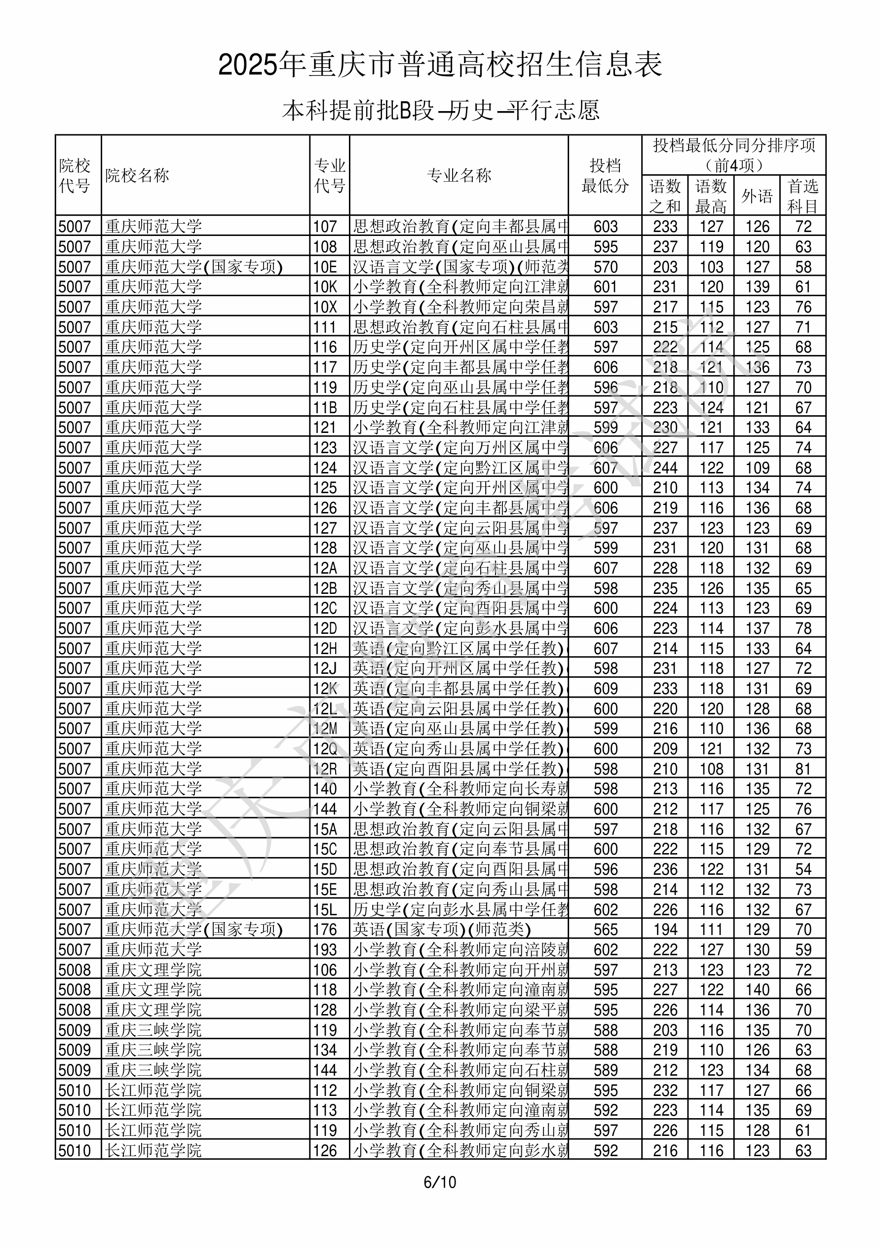 2025年重庆高考普通类本科提前批B段 重庆师范大学 的 汉语言文学 专业录取分数溯源信息