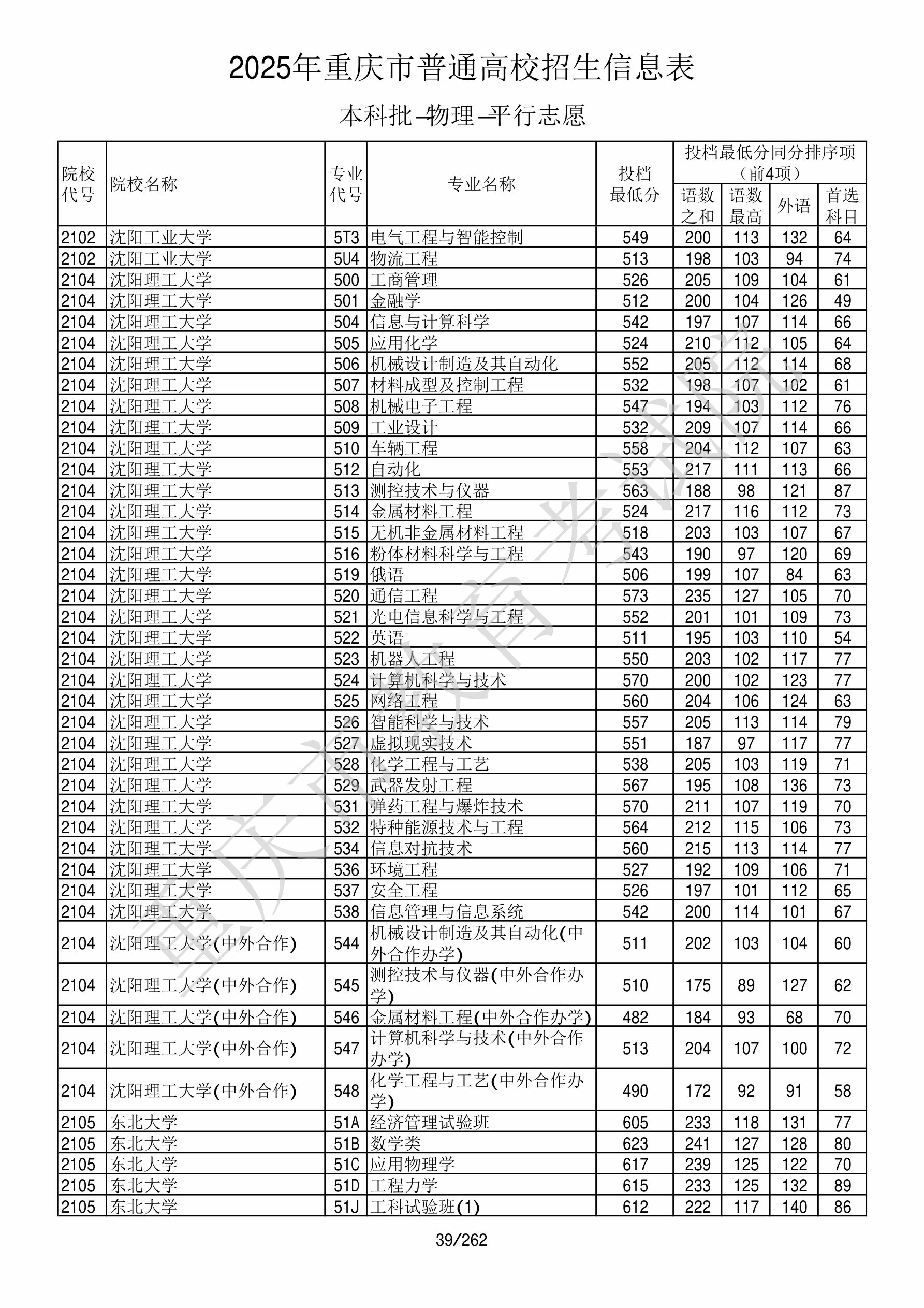 2025年重庆高考普通类本科批 沈阳理工大学 的 光电信息科学与工程 专业录取分数溯源信息