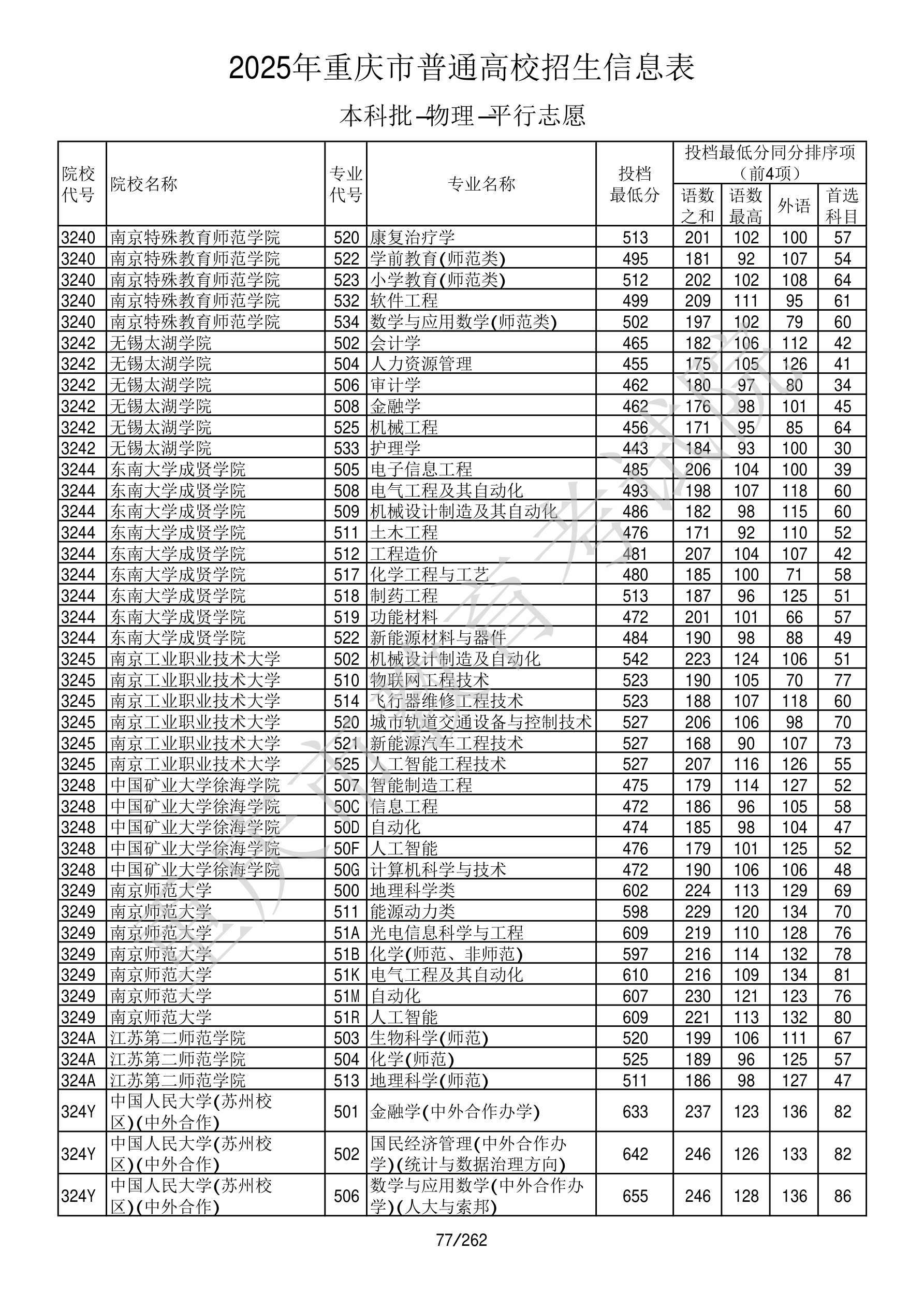 | 院校代码 | 院校名称 | 专业代码 | 专业名称 | 最低分数 | 最低位次 | 专业层次 | 限考科目 | 投档 |