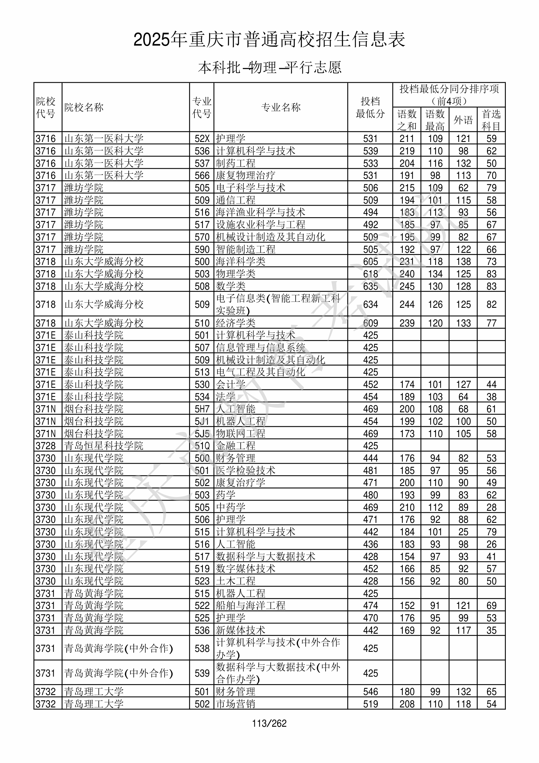 | 院校代码 | 院校名称 | 专业代码 | 专业名称 | 最低分数 | 最低位次 | 专业层次 | 限考科目 | 投档 |