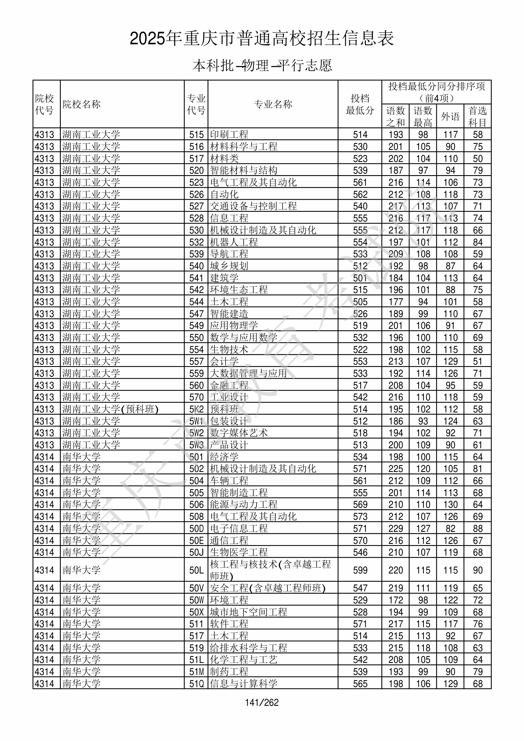2025年重庆高考普通类本科批 南华大学 的 智能制造工程 专业录取分数溯源信息