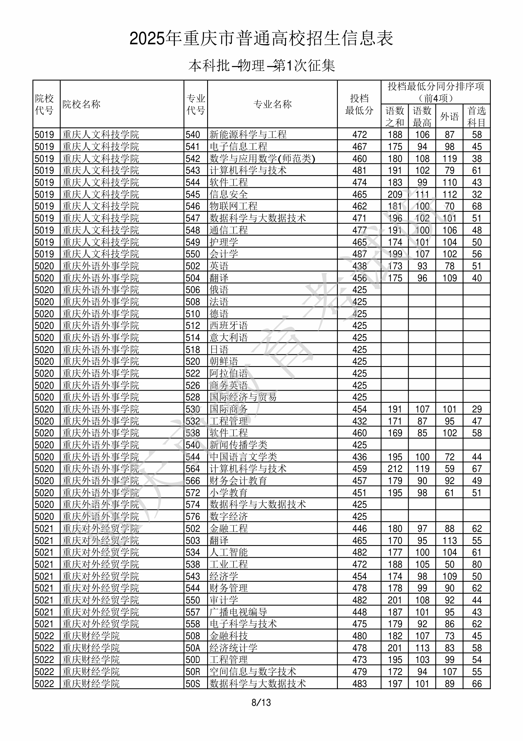 2025年重庆高考普通类本科批 重庆财经学院 的 数据科学与大数据技术 专业录取分数溯源信息