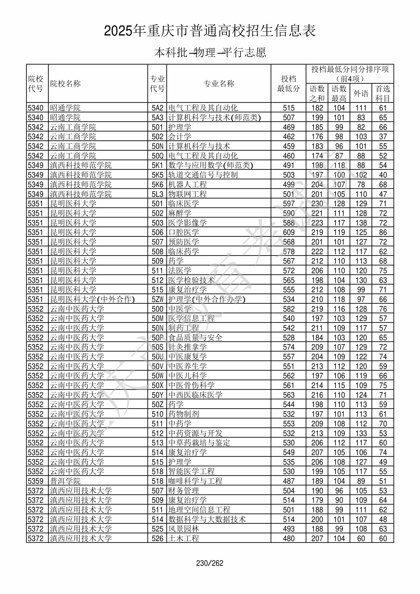 | 院校代码 | 院校名称 | 专业代码 | 专业名称 | 最低分数 | 最低位次 | 专业层次 | 限考科目 | 投档 |