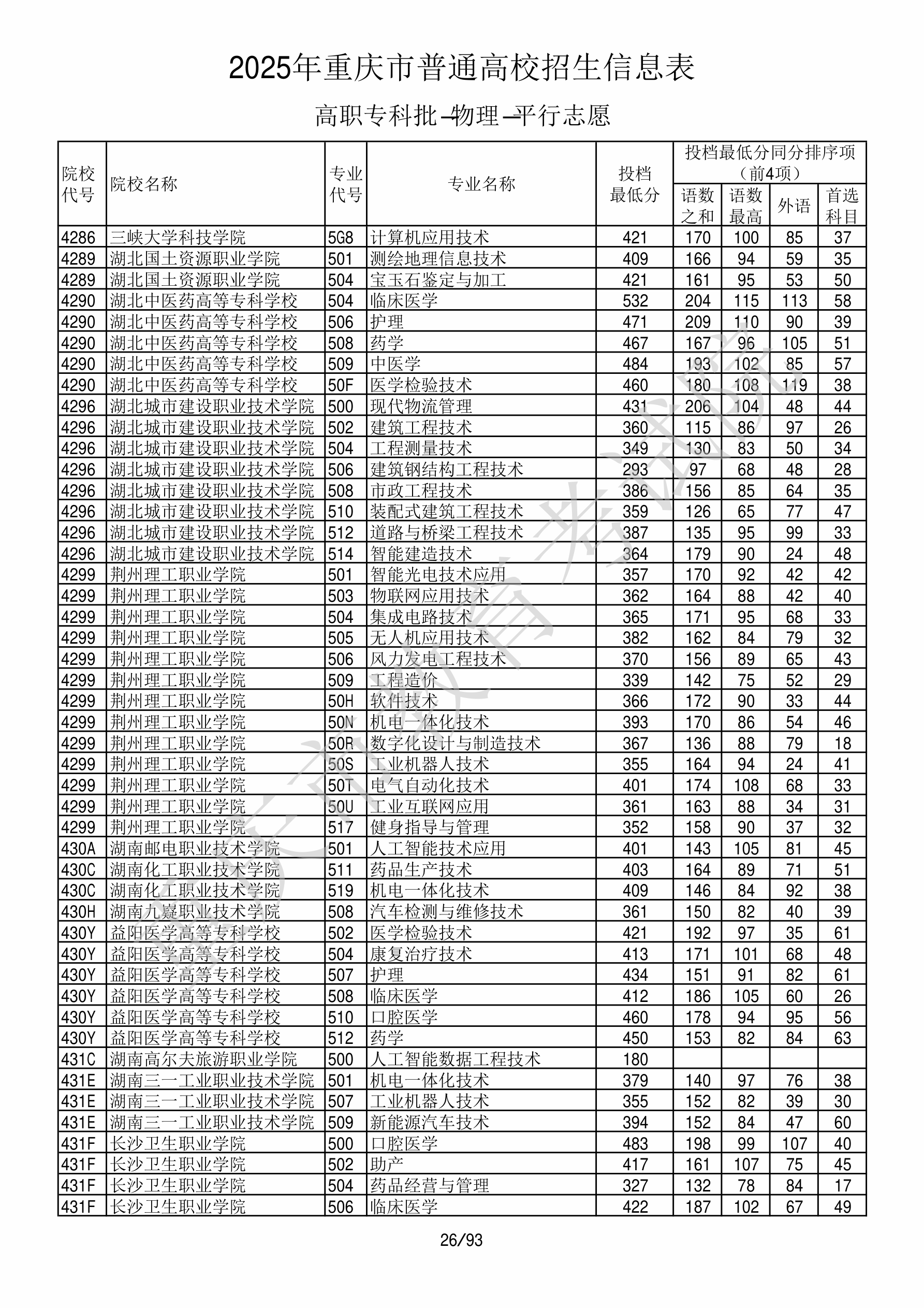 2025年重庆高考普通类高职(专科)批 益阳医学高等专科学校 的 药学 专业录取分数溯源信息