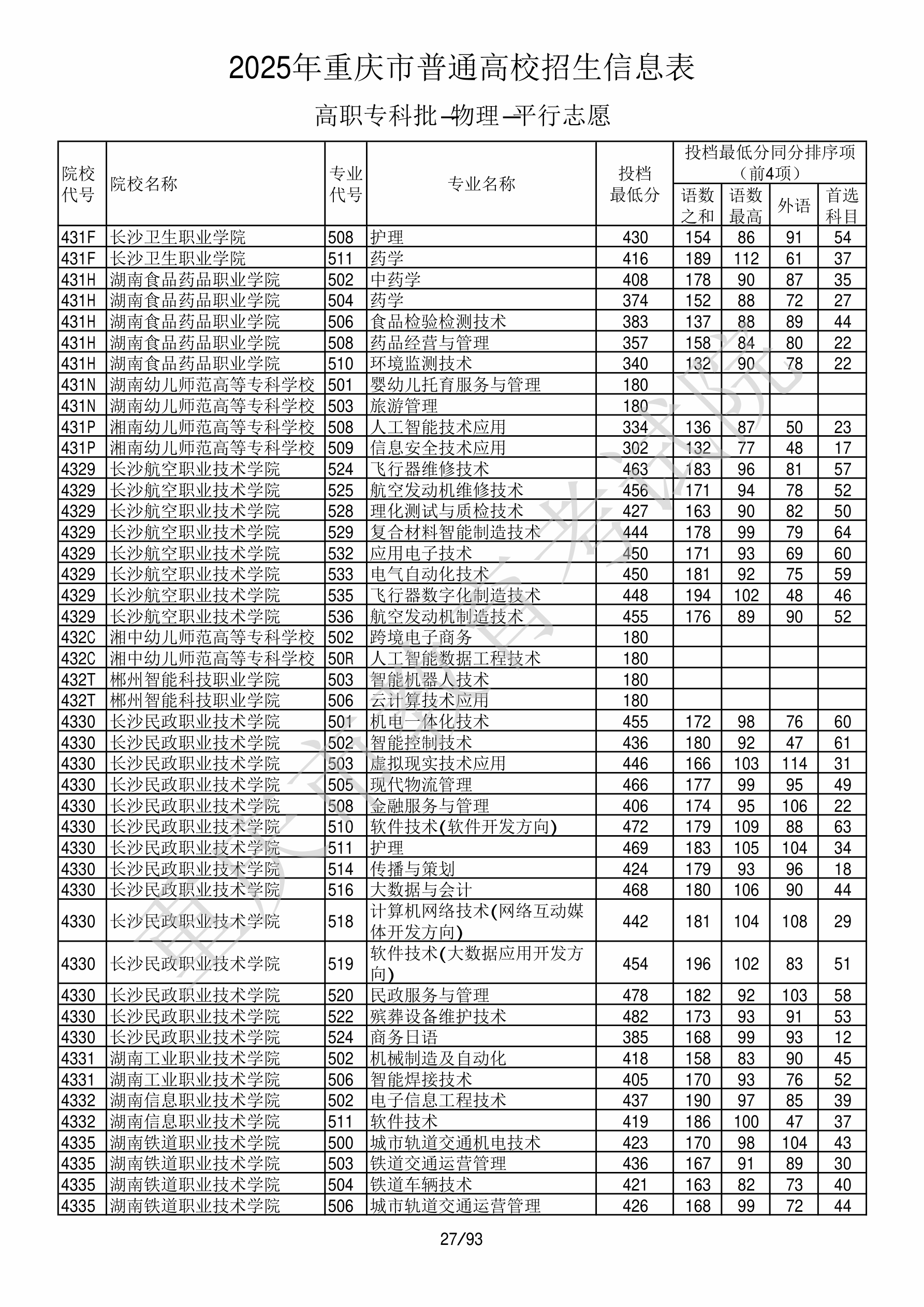 2025年重庆高考普通类高职(专科)批 湖南幼儿师范高等专科学校 的 旅游管理 专业录取分数溯源信息