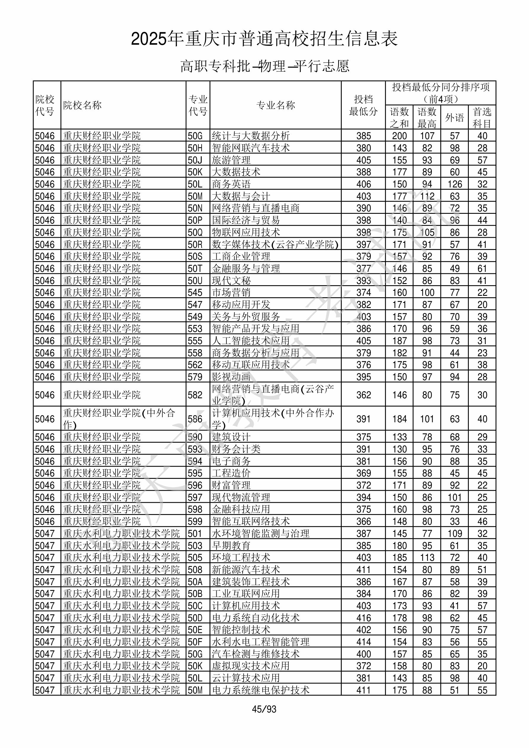 | 5047 | 重庆水利电力职业技术学院 | 503 | 早期教育 | 385 | 118146 | 专科 | 物理 ,再选: 不限 | 1 |