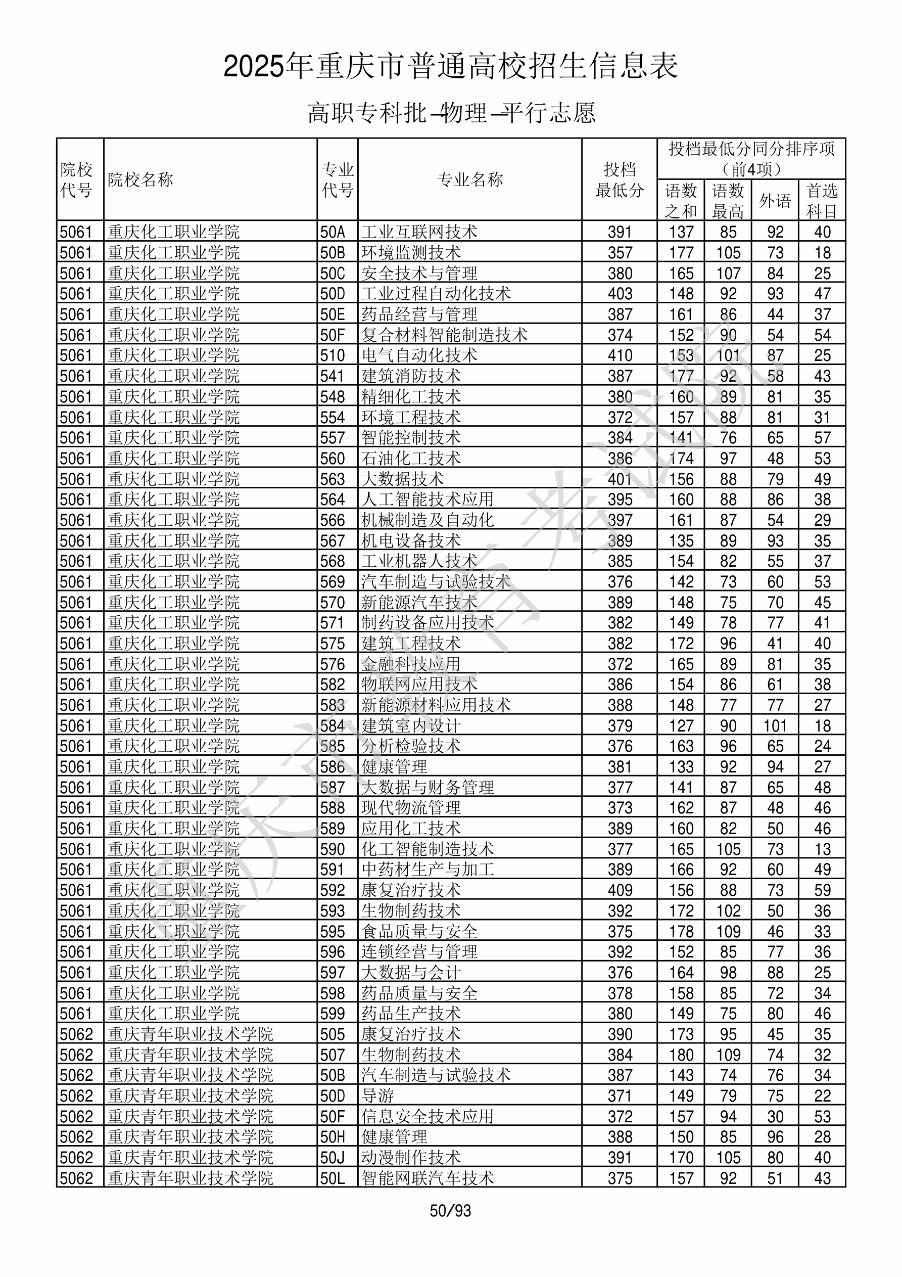 2025年重庆高考普通类高职(专科)批 重庆化工职业学院 的 生物制药技术 专业录取分数溯源信息
