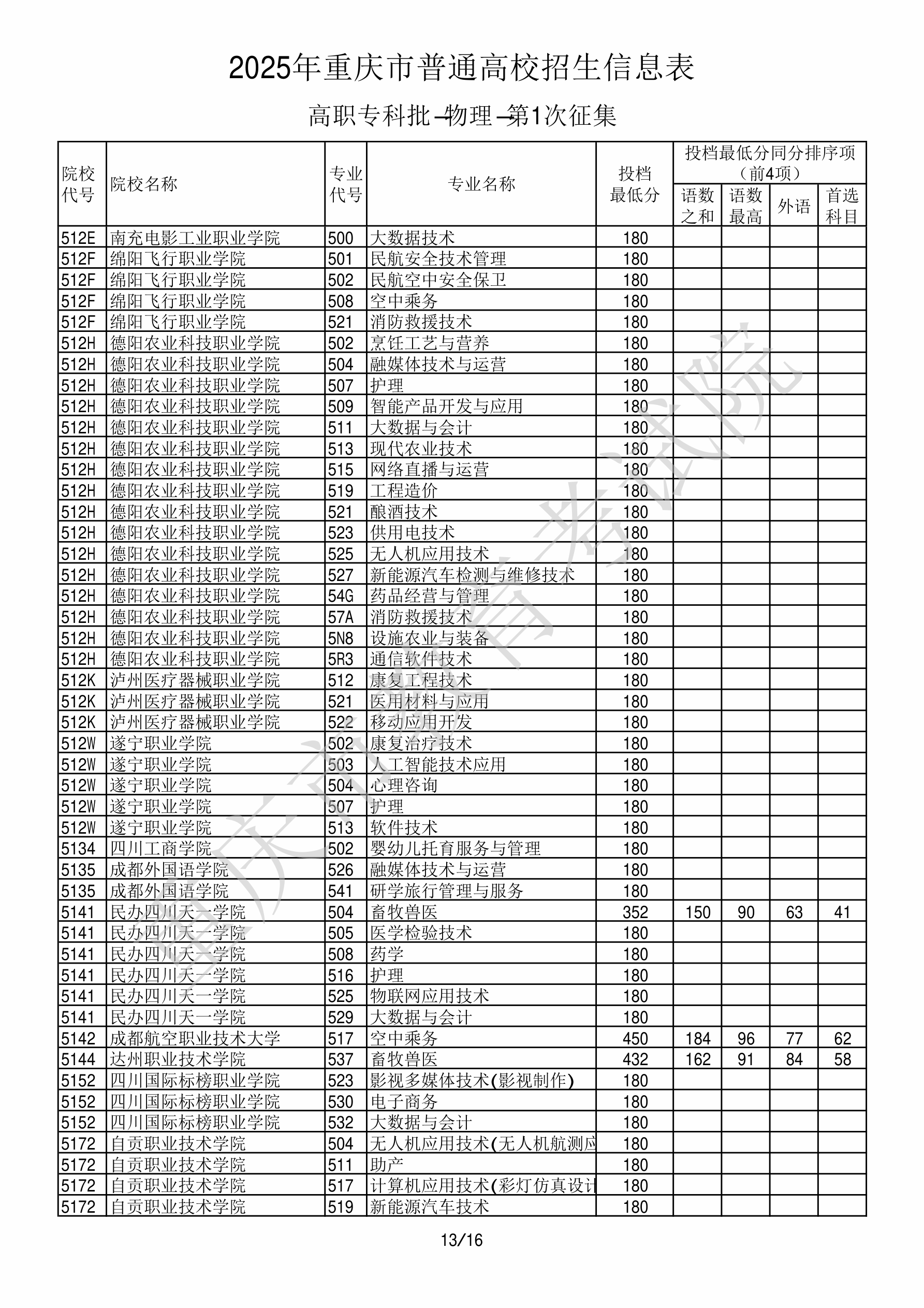 | 512E | 南充电影工业职业学院 | 500 | 大数据技术 | 180 | 139478 | 专科 | 物理 ,再选: 不限 | 1,2,3 |