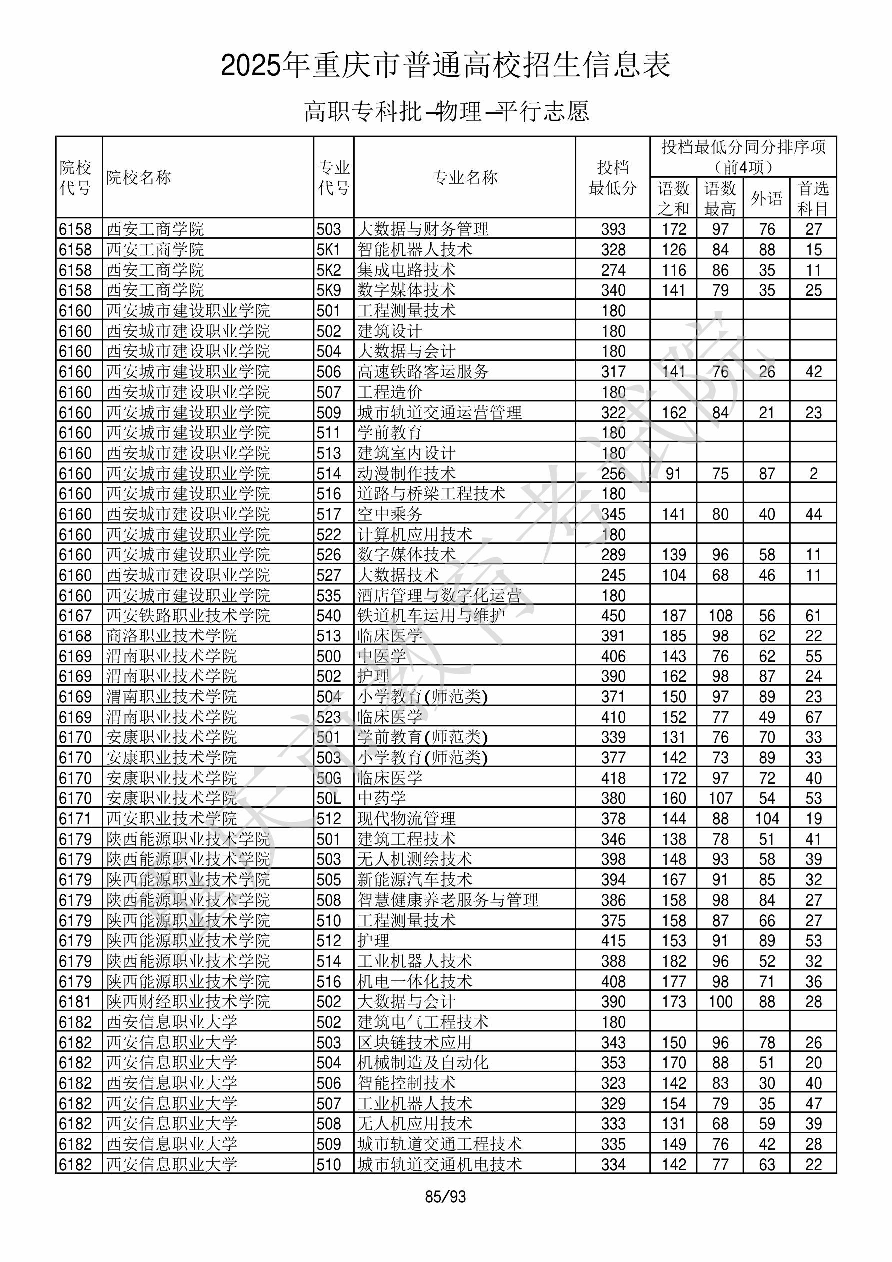 2025年重庆高考普通类高职(专科)批 西安城市建设职业学院 的 大数据技术 专业录取分数溯源信息