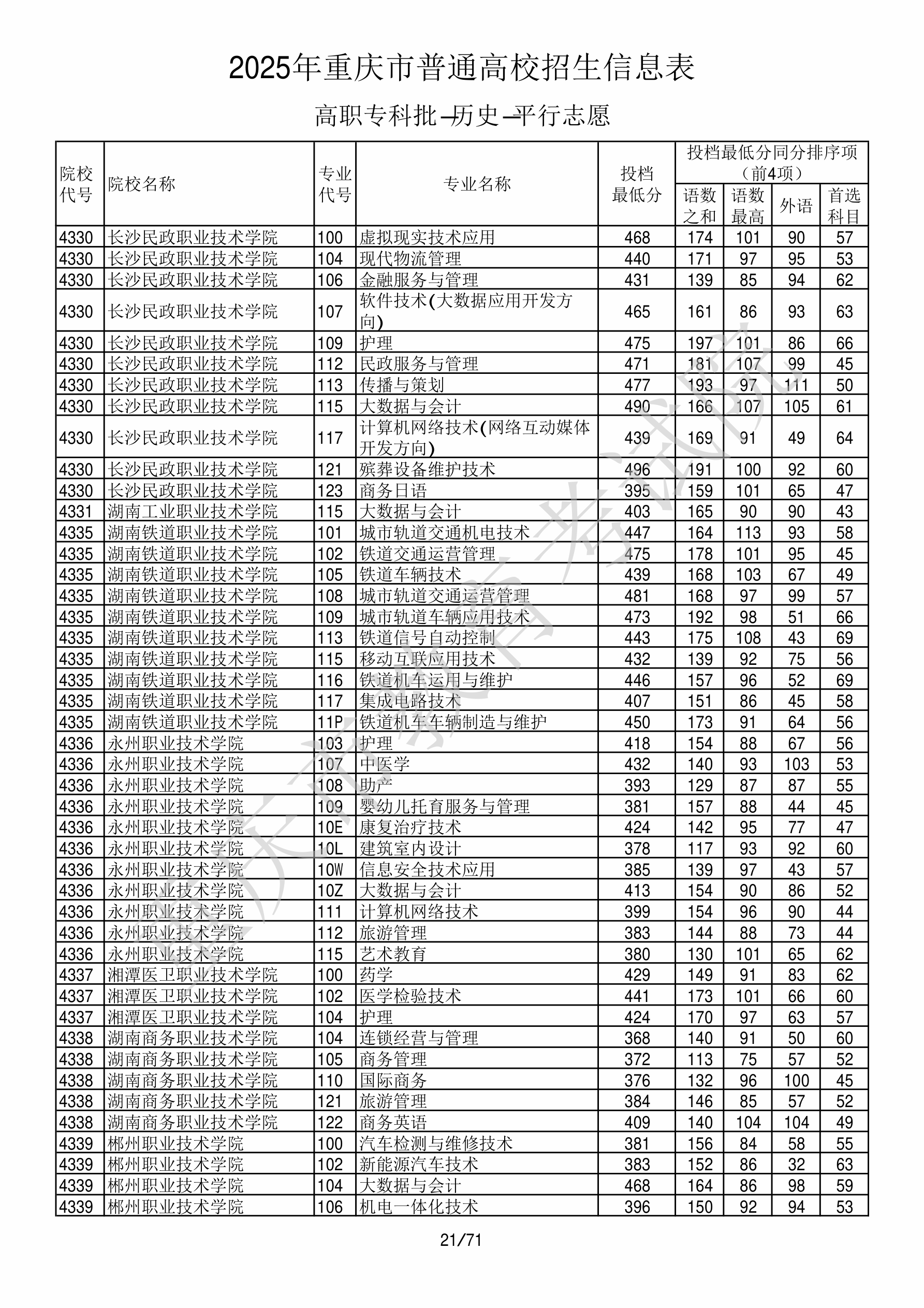 2025年重庆高考普通类高职(专科)批 长沙民政职业技术学院 的 计算机网络技术 专业录取分数溯源信息