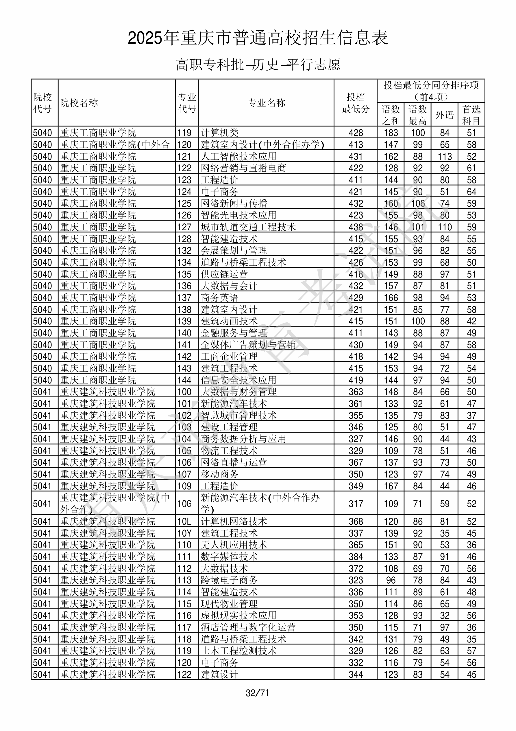| 5040 | 重庆工商职业学院 | 123 | 工程造价 | 411 | 43442 | 专科 | 历史 ,再选: 不限 | 1 |