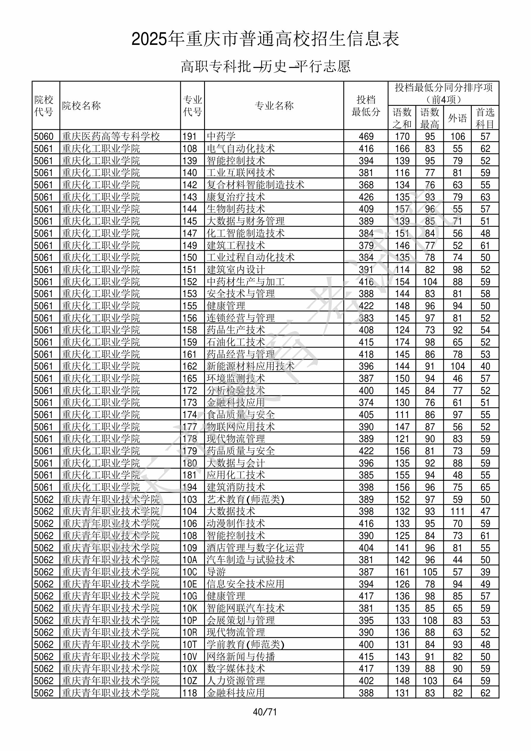 | 5062 | 重庆青年职业技术学院 | 10X | 数字媒体技术 | 417 | 41680 | 专科 | 历史 ,再选: 不限 | 1 |