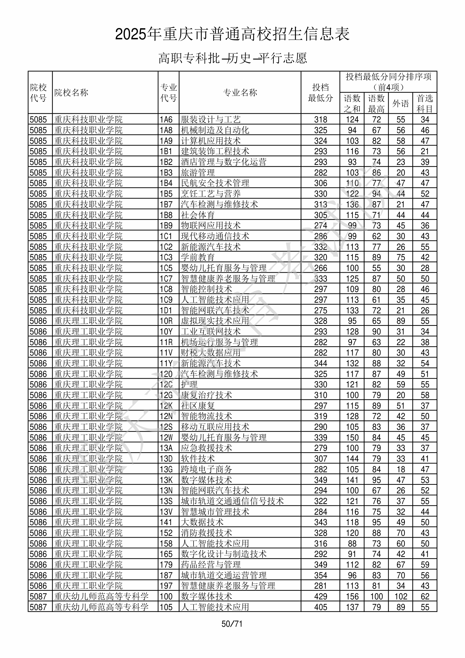 | 院校代码 | 院校名称 | 专业代码 | 专业名称 | 最低分数 | 最低位次 | 专业层次 | 限考科目 | 投档 |