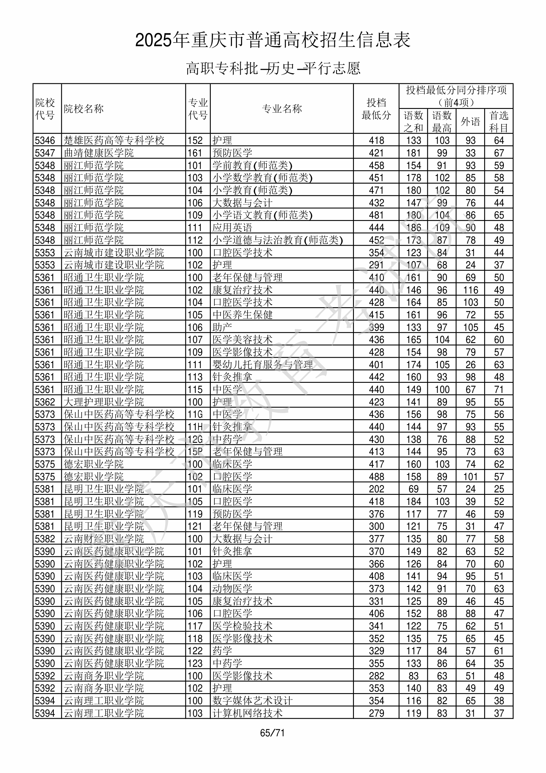2025年重庆高考普通类高职(专科)批 云南城市建设职业学院 的 护理 专业录取分数溯源信息