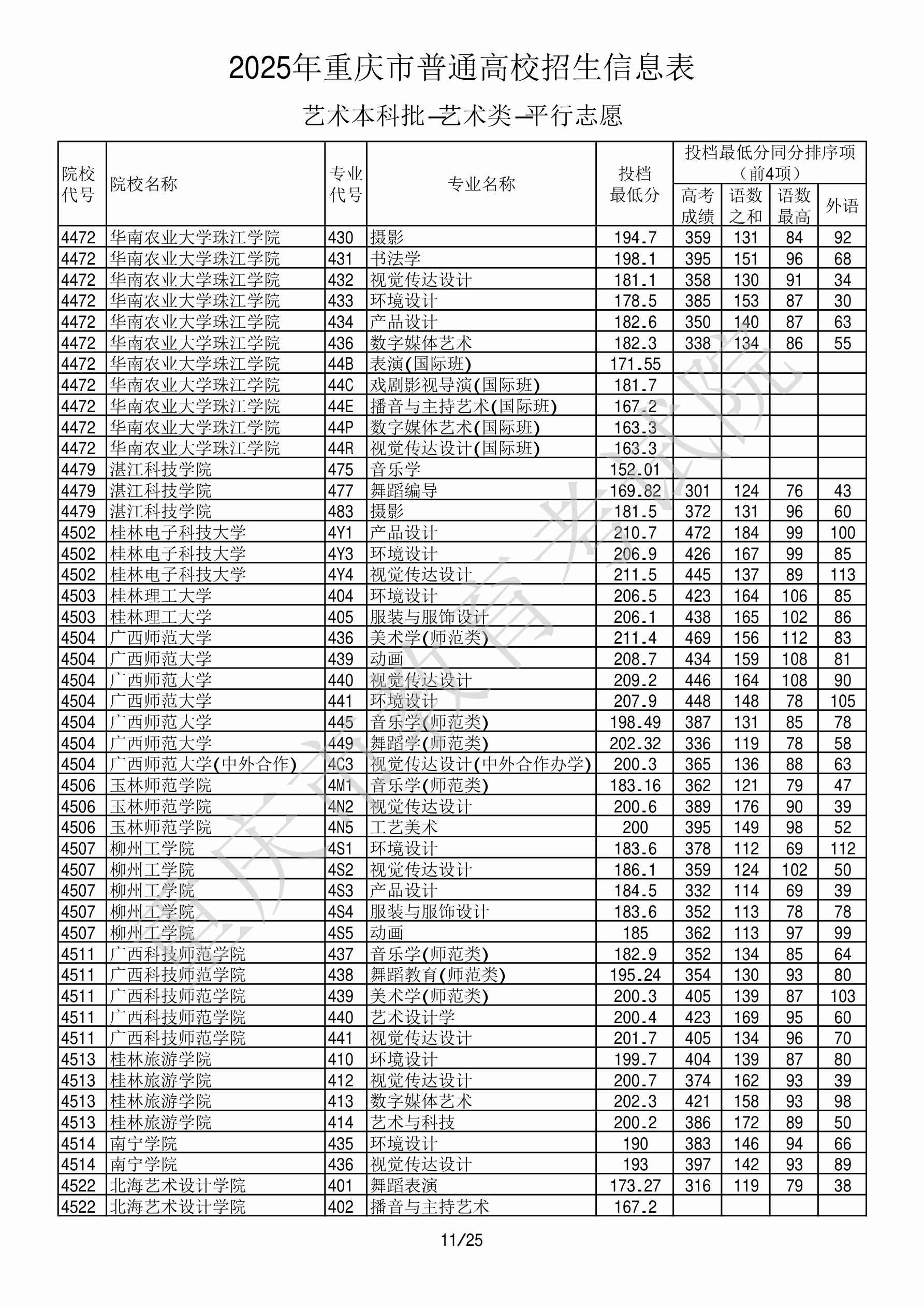 2025年重庆高考艺术类本科批美术与设计类 南宁学院 的 环境设计 专业录取分数溯源信息