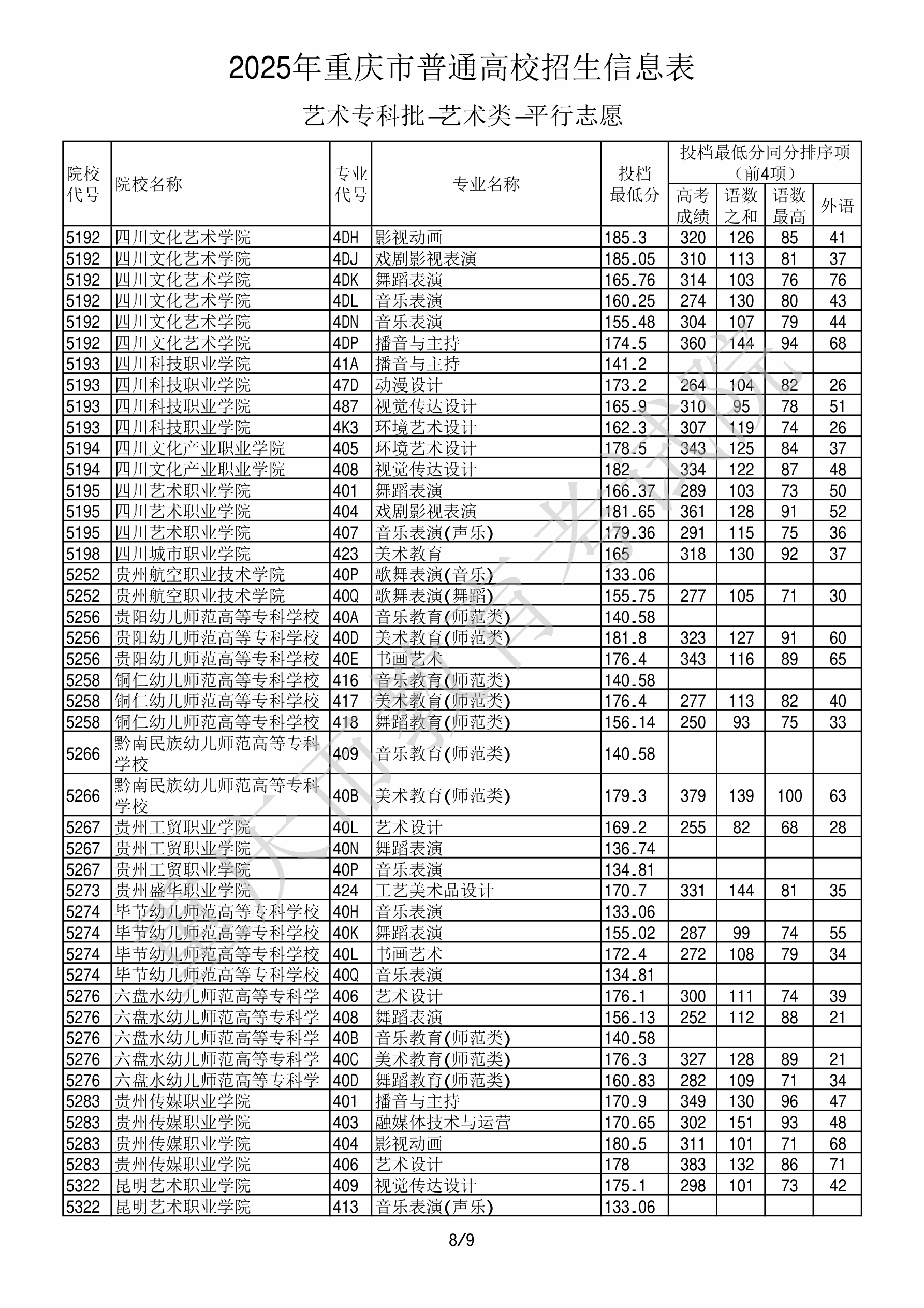 | 5192 | 四川文化艺术学院 | 4DP | 播音与主持 | 160.20 | 1281 | 专科 | 不限 | 1,2 |