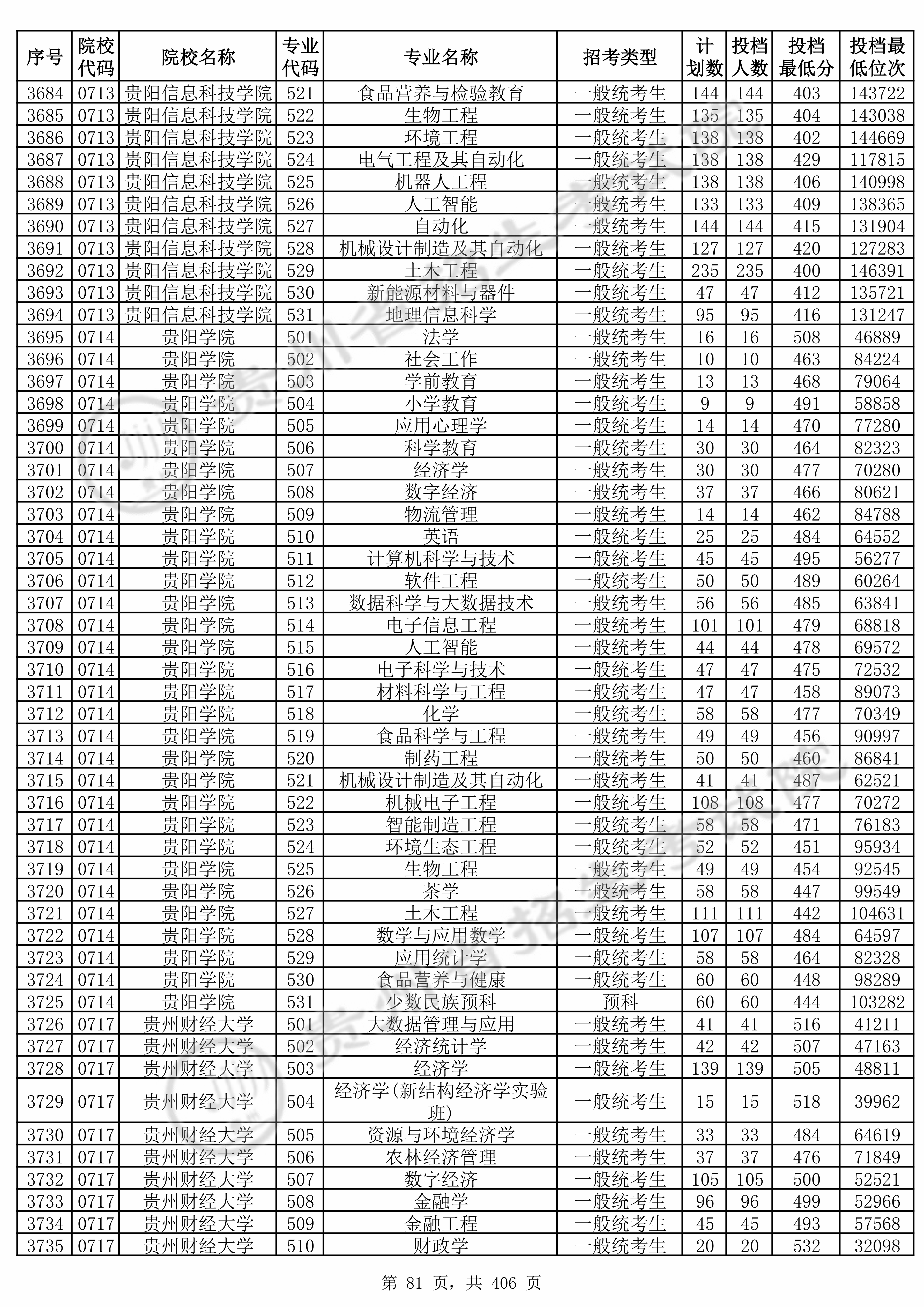 | 0713 | 贵阳信息科技学院 | 521 | 食品营养与检验教育 | 403 | 143722 | 本科 | 物理 ,再选: 化学 | 1,2 |