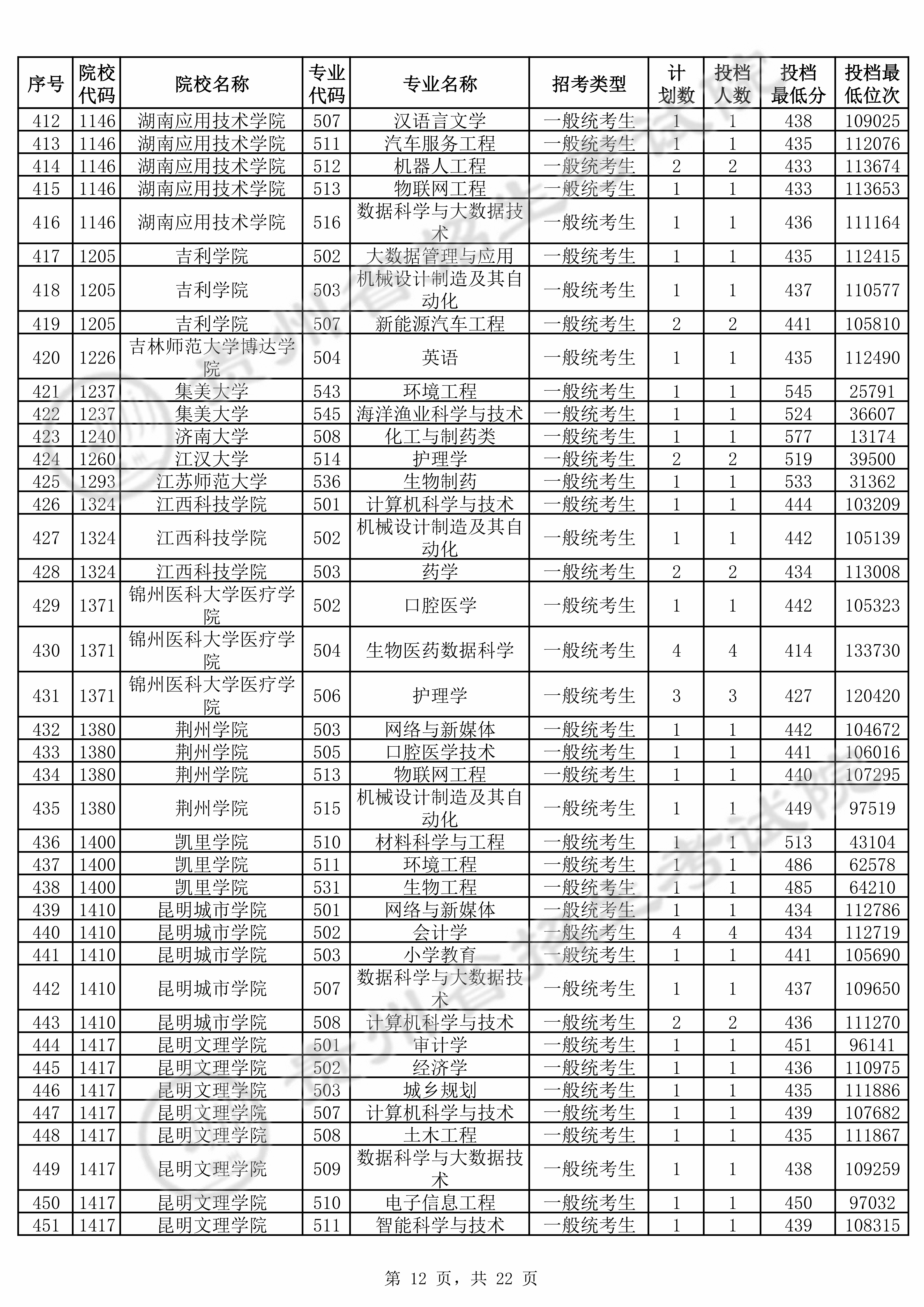 | 院校代码 | 院校名称 | 专业代码 | 专业名称 | 最低分数 | 最低位次 | 专业层次 | 限考科目 | 投档 |