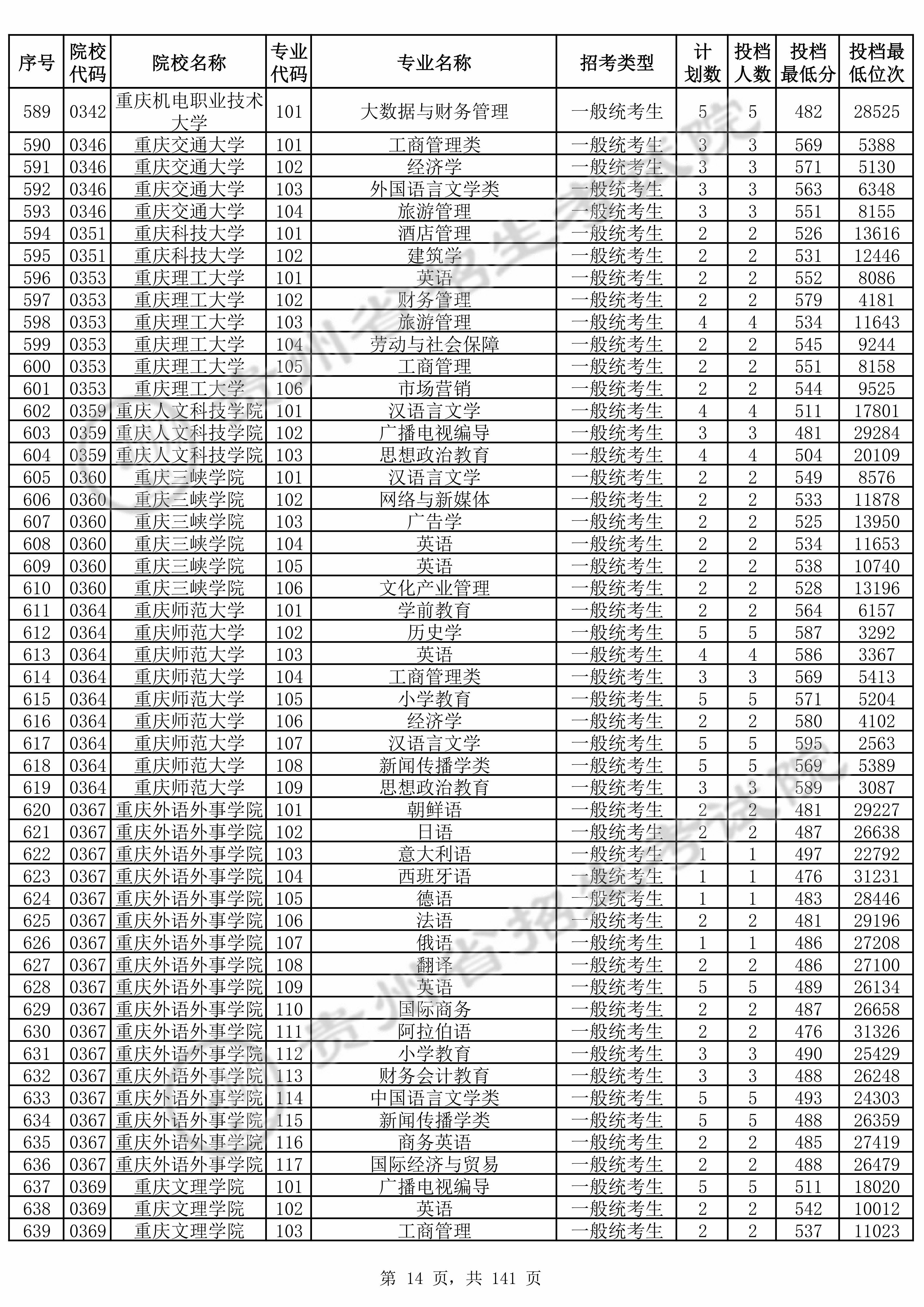 | 0346 | 重庆交通大学 | 103 | 外国语言文学类 | 563 | 6348 | 本科 | 历史 ,再选: 不限 | 1 |