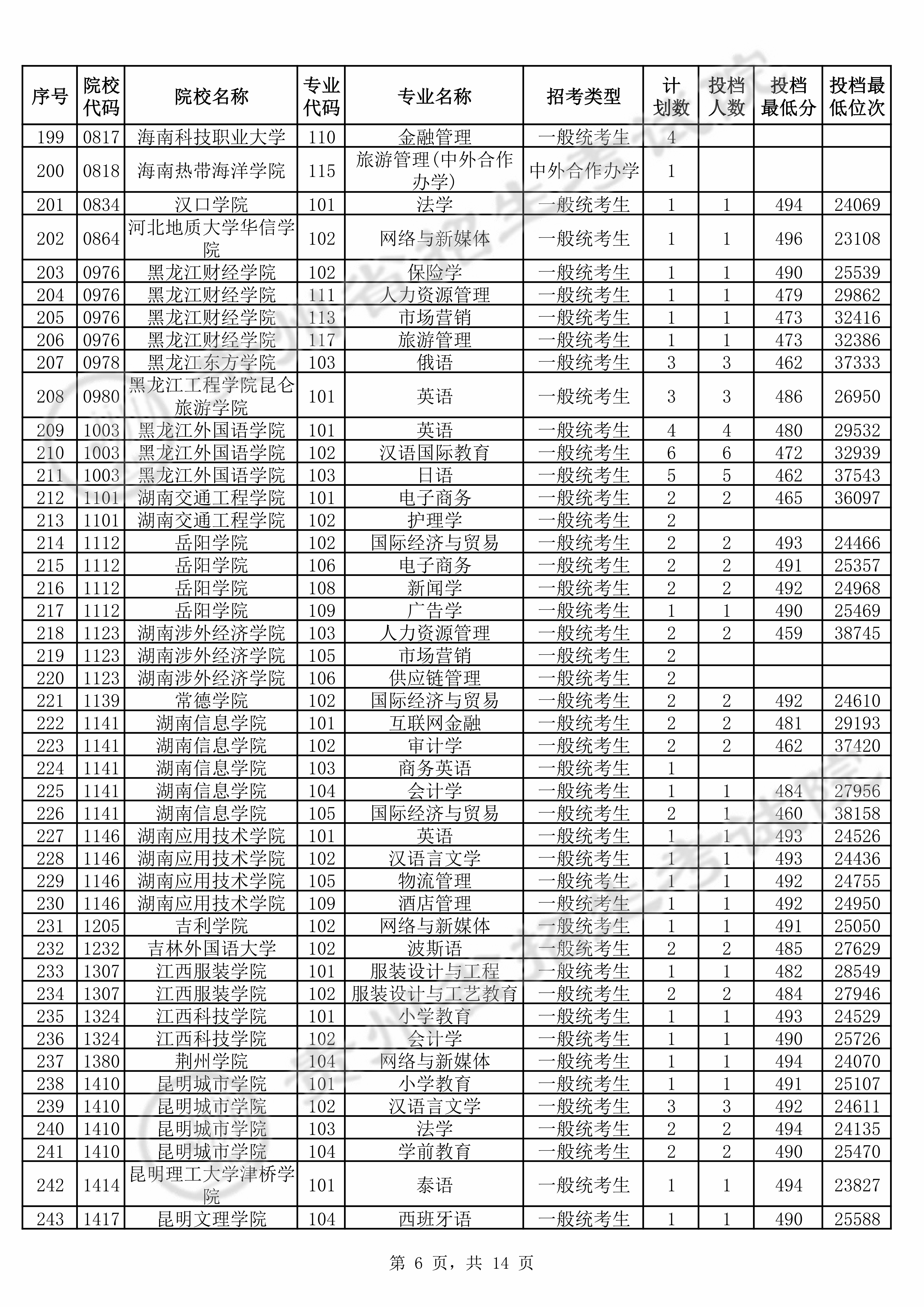 | 院校代码 | 院校名称 | 专业代码 | 专业名称 | 最低分数 | 最低位次 | 专业层次 | 限考科目 | 投档 |