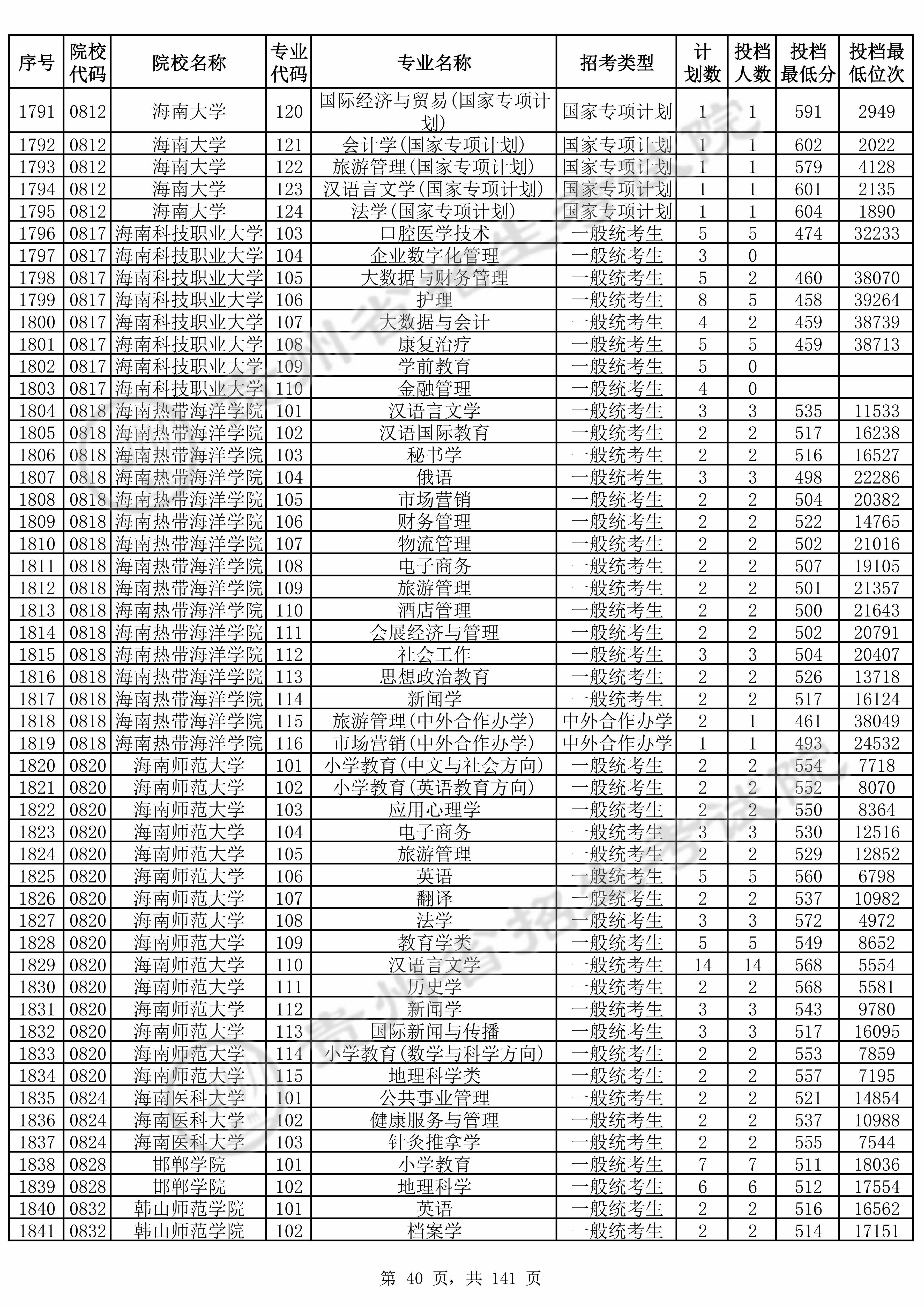 全部专业投档情况