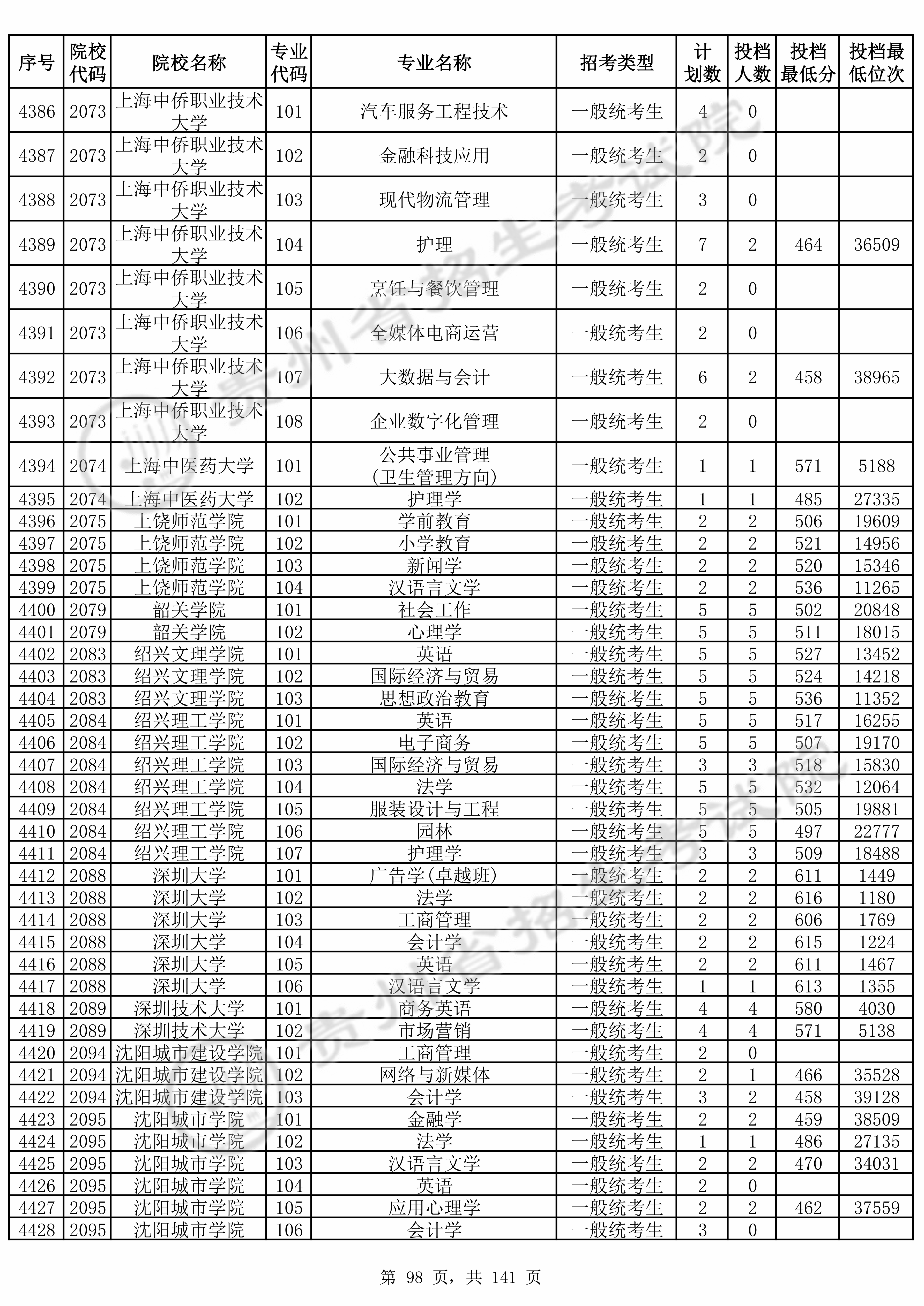 全部专业投档情况