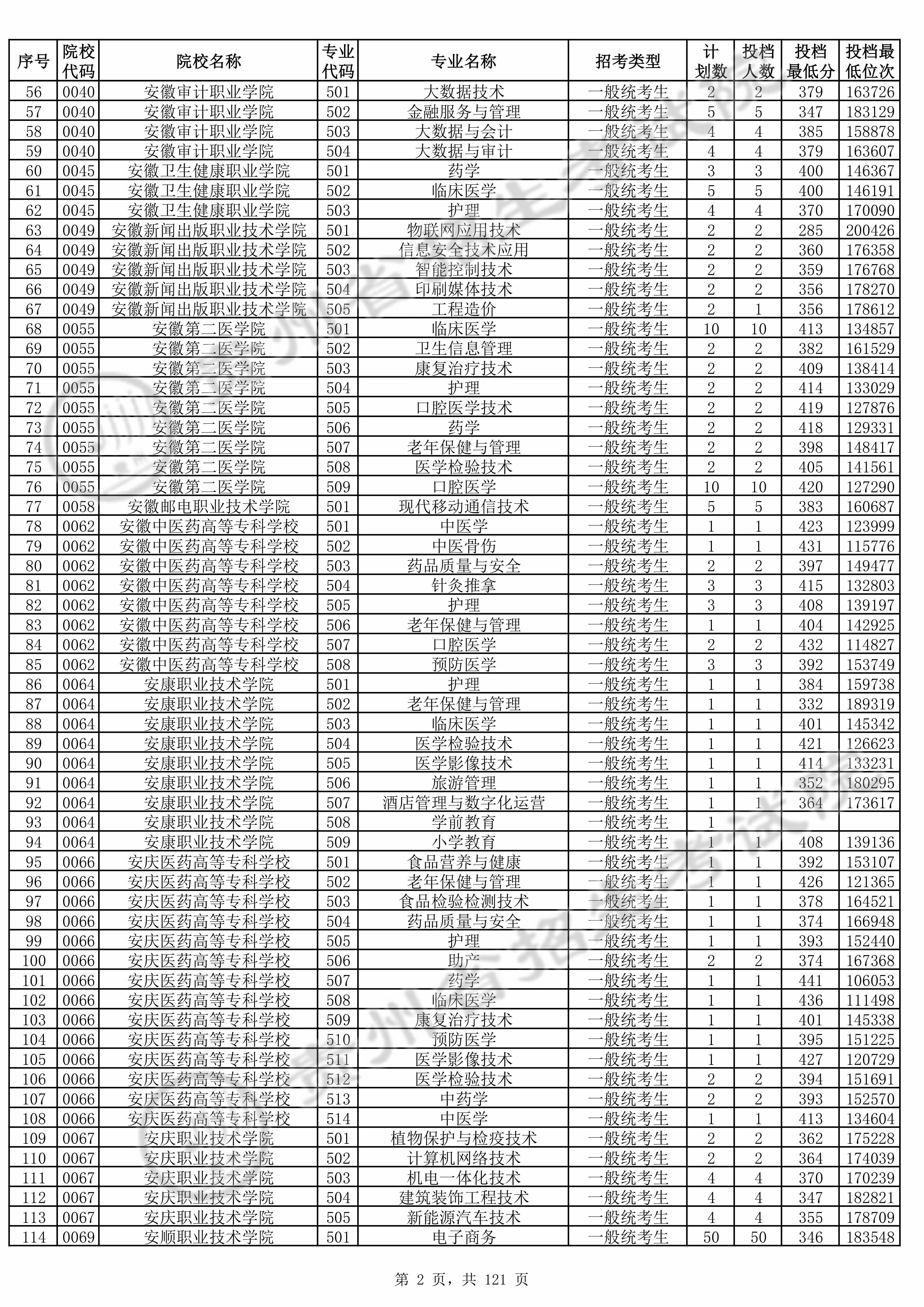 | 0045 | 安徽卫生健康职业学院 | 502 | 临床医学 | 400 | 146191 | 专科 | 物理 ,再选: 不限 | 1 |